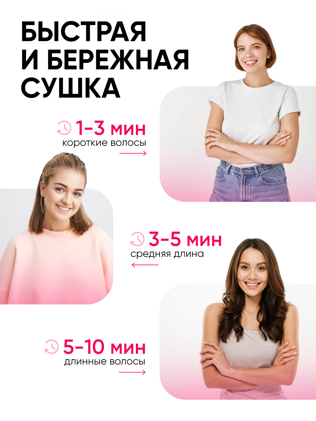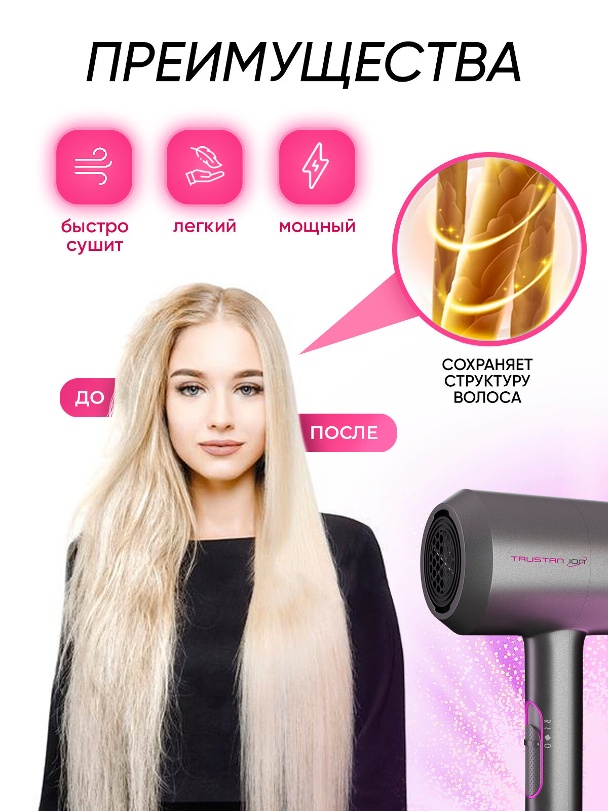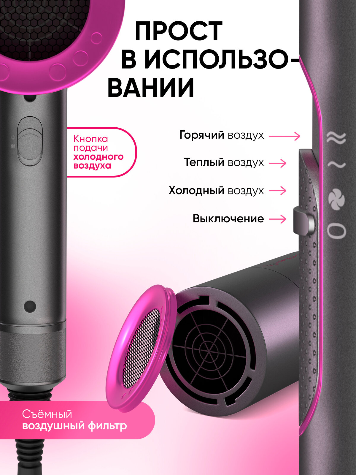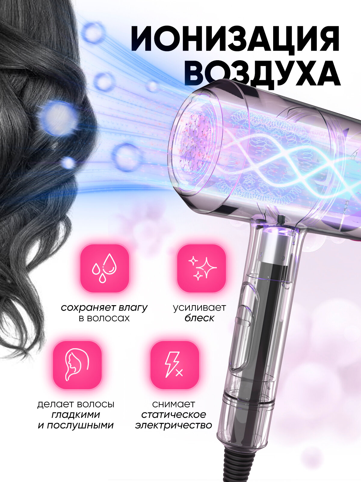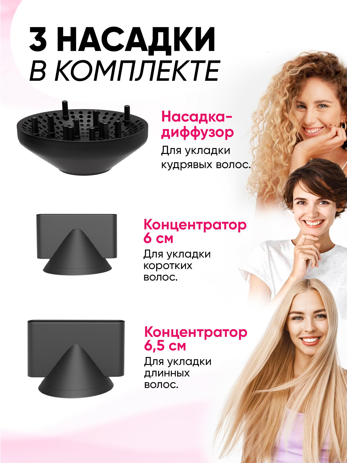 Фен для волос Super Hair Dryer профессиональный с ионизацией / Набор для укладки волос, 3 насадки Розовый/Серый интересное: