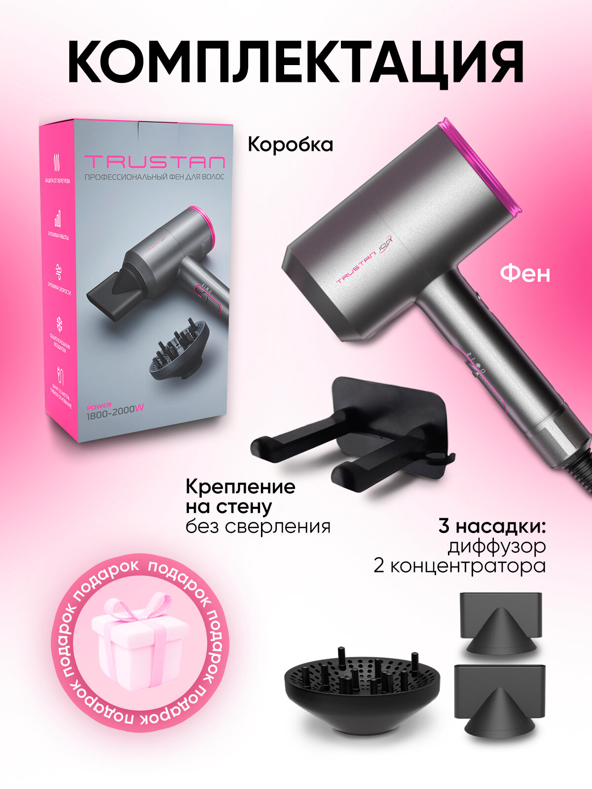 | Подробная комплектация | Фен для волос профессиональный, 2 насадки-концентраторы для волос различной длины, диффузор для придания объема и создания волн, настенное крепление, резинки для волос в ПОДАРОК |