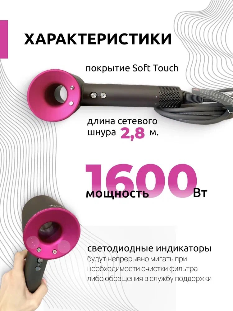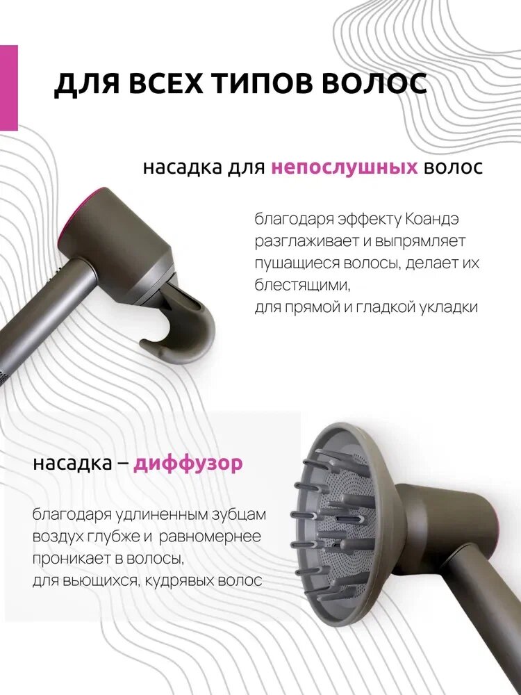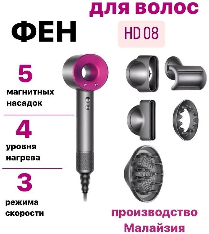 Фен для волос HD08 , для укладки волос , 5 насадок , Малайзия , фуксия , темно розовый интересное: