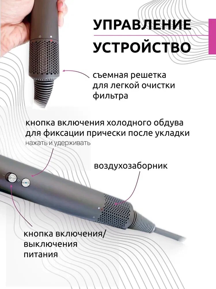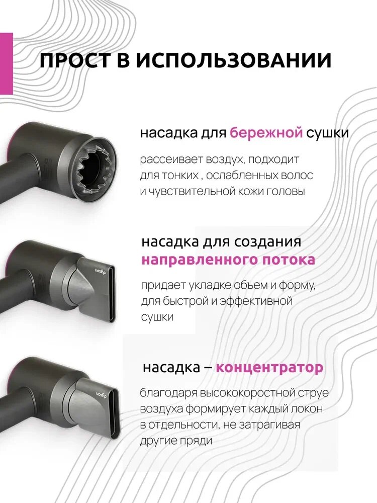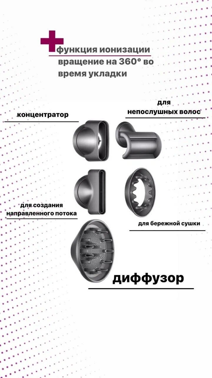 | Насадки | диффузор / для бережного высушивания / для непослушных волос / для спиральной укладки / концентратор |