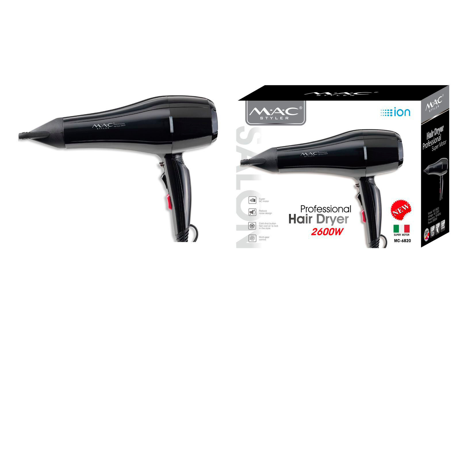 Купить Профессиональный фен 2600W с 2 режимами нагрева и 2 скоростями, холодный поток, ионизация, тихий мотор