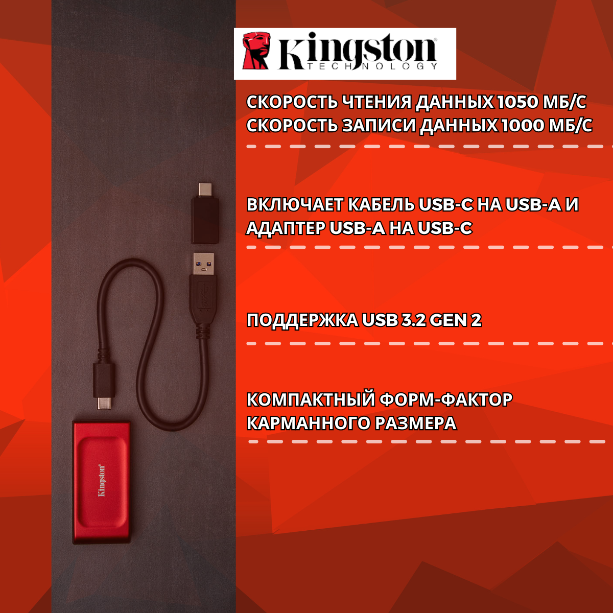 Портативный SSD Kingston SXS2000, USB 3.2 gen.2x2 / USB Type-C, OTG, 1Tб