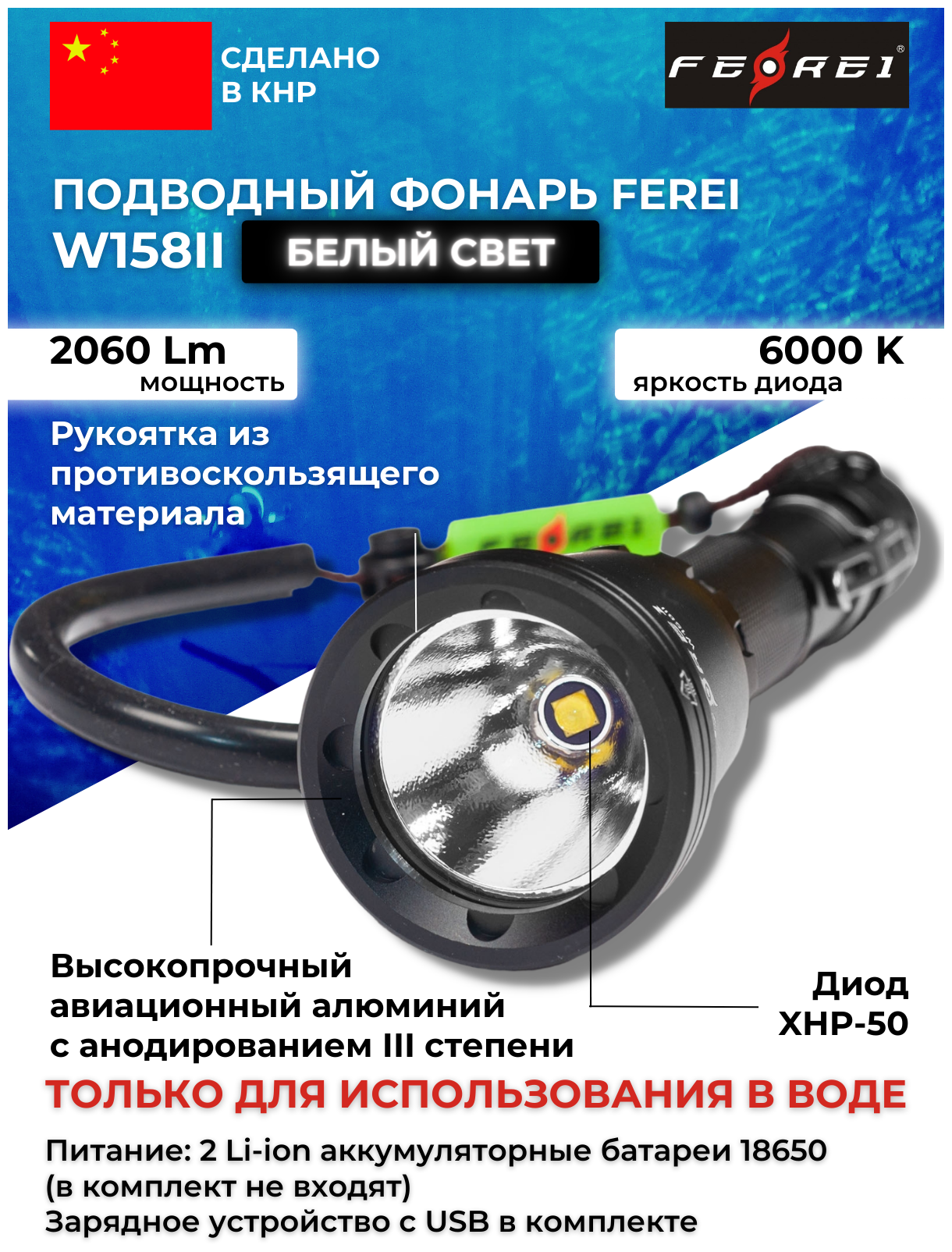 Фонарь подводный FEREI W158II, белый свет, 2060Lm, 6000К интересное: