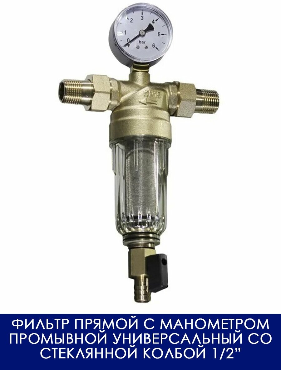 Купить Фильтр прямой с манометром промывной универсальный со стеклянной колбой 1/2"