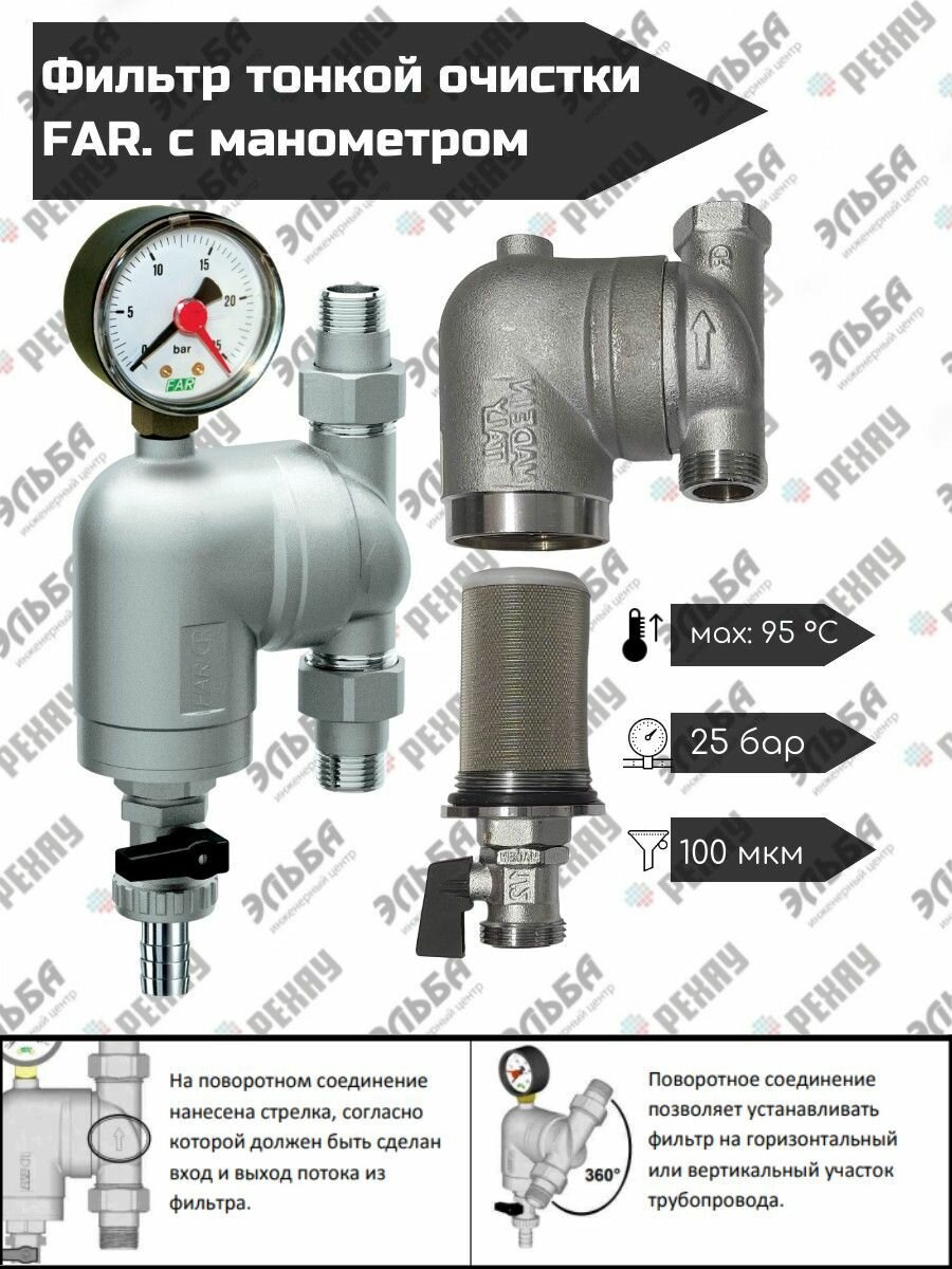 Фильтр 100мкм, с магн.встав., с манометром, Max: 95 C, 25 бар, поворот.соед. 1/2" НР FAR FA 39M4 12100 интересное: