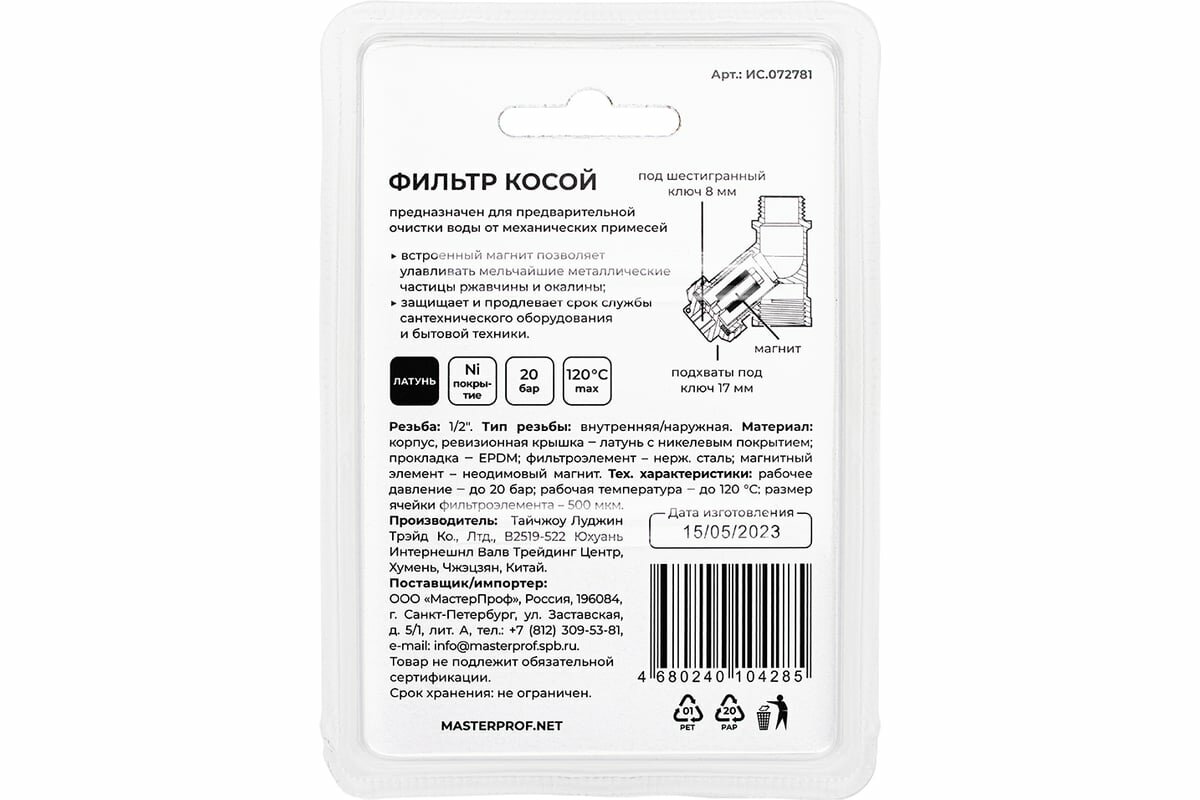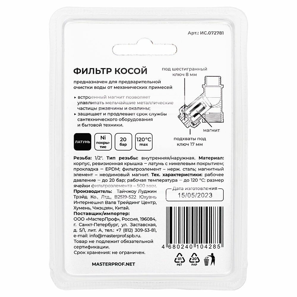MPF Косой фильтр грязевик 1/2", в/н, с магнитом ИС.072781