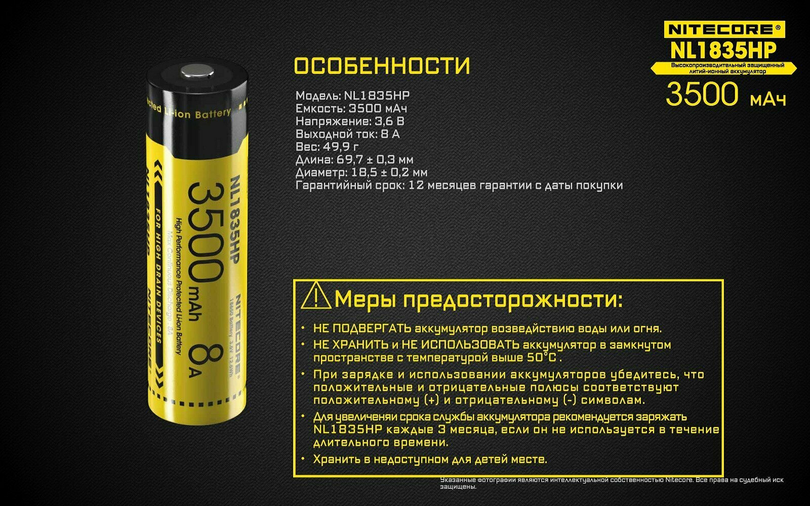 Ниже Вы можете прочитать отзывы на Nitecore Аккумулятор NITECORE NL1835HP 18650 Li-Ion 8А, 3500 mAh, ознакомится с подробными характеристиками, посмотреть интересные обзоры и фотографии на Nitecore Аккумулятор NITECORE NL1835HP 18650 Li-Ion 8А, 3500 mAh.