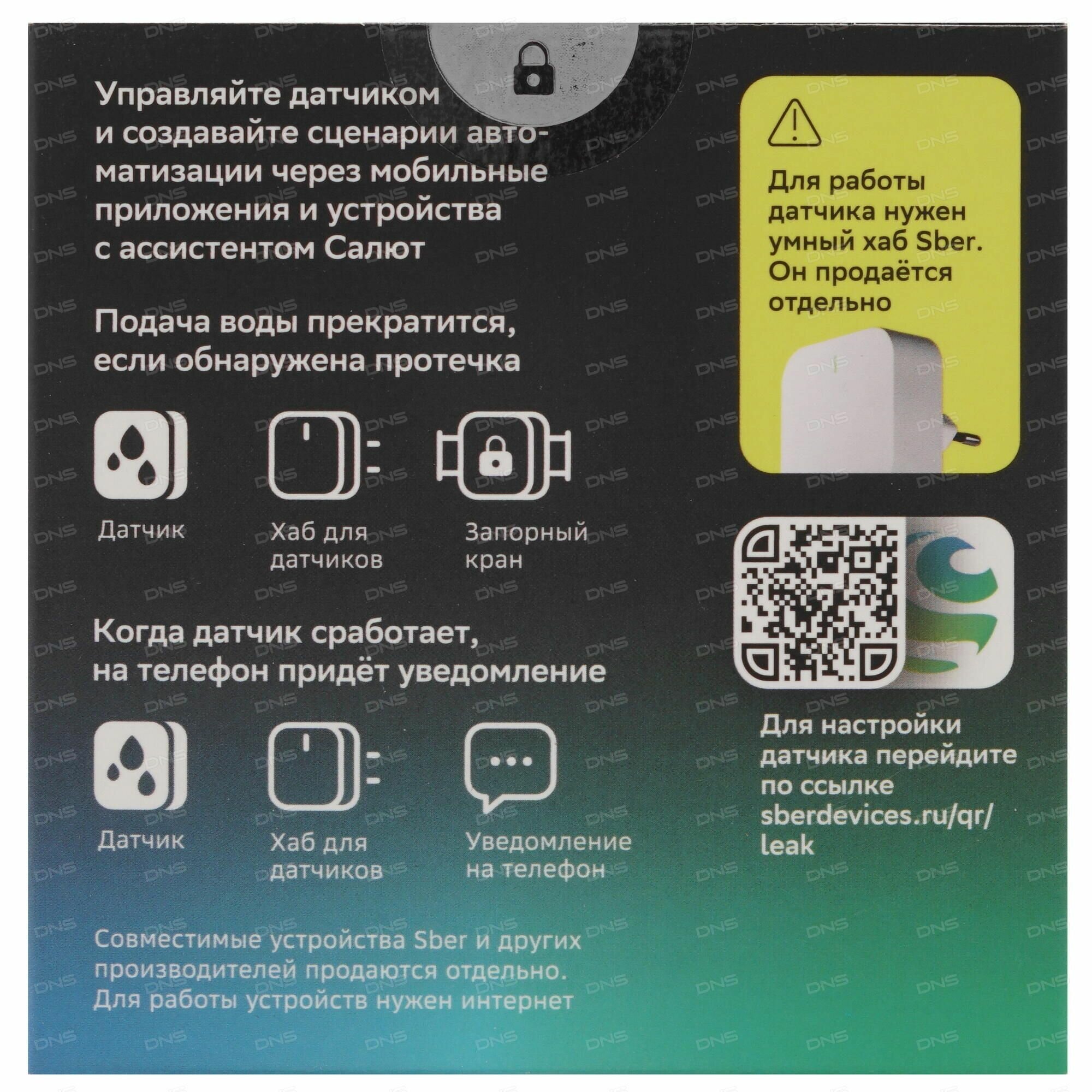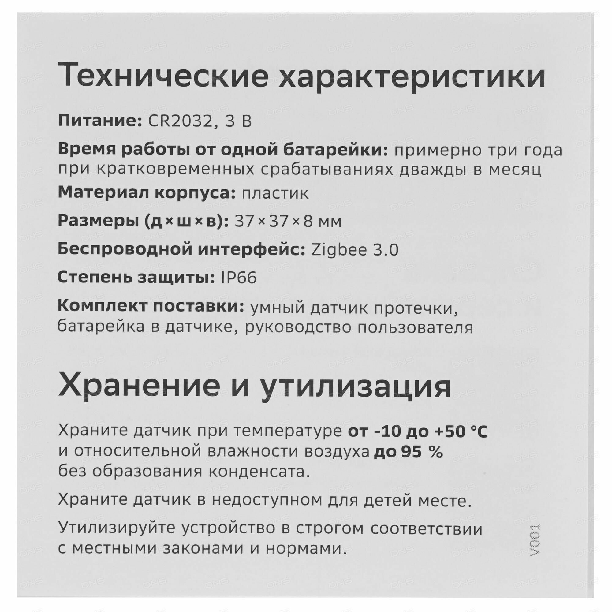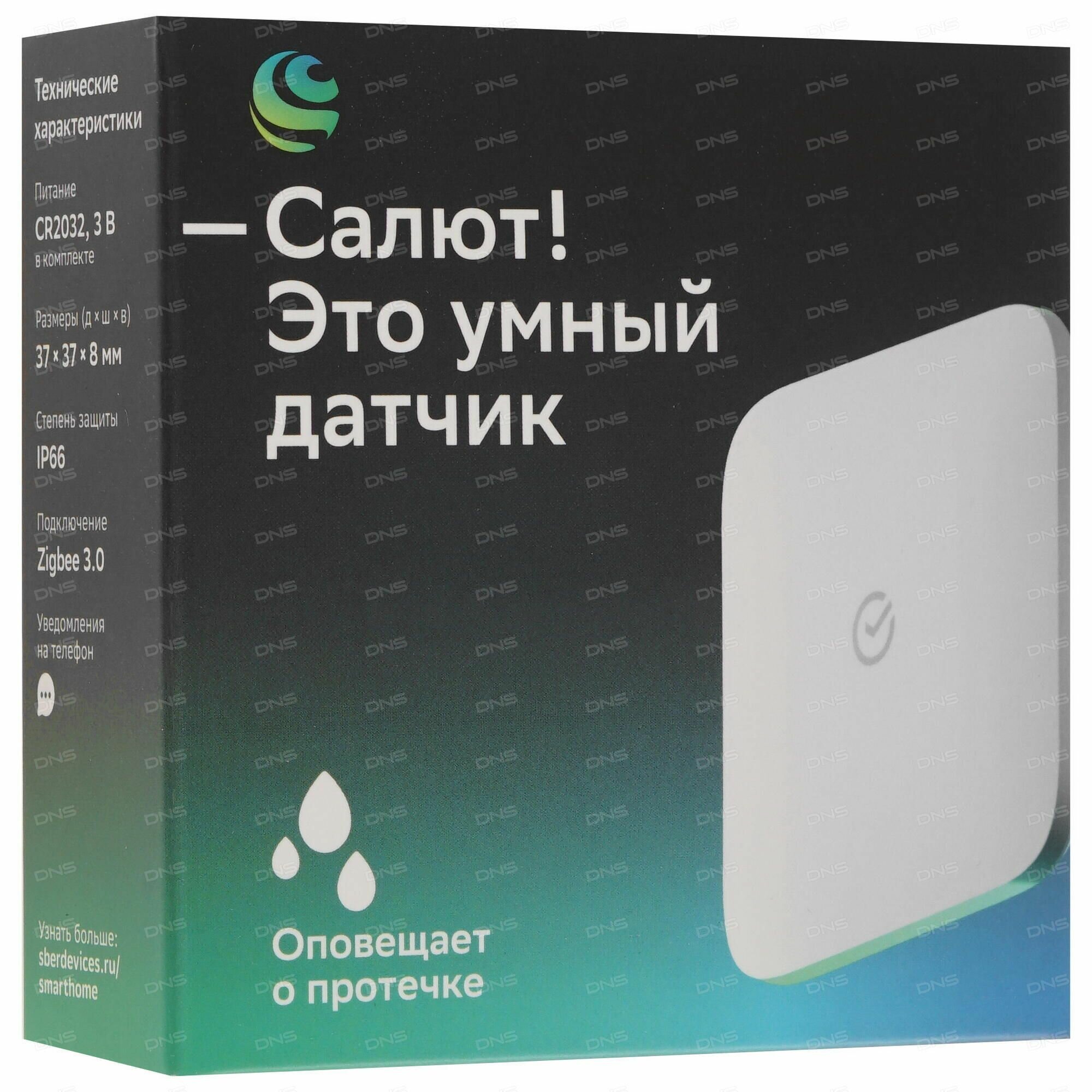 | Дополнительная информация | Комплект поставки: умный датчик протечки Sber, батарейка в датчике, руководство пользователя |