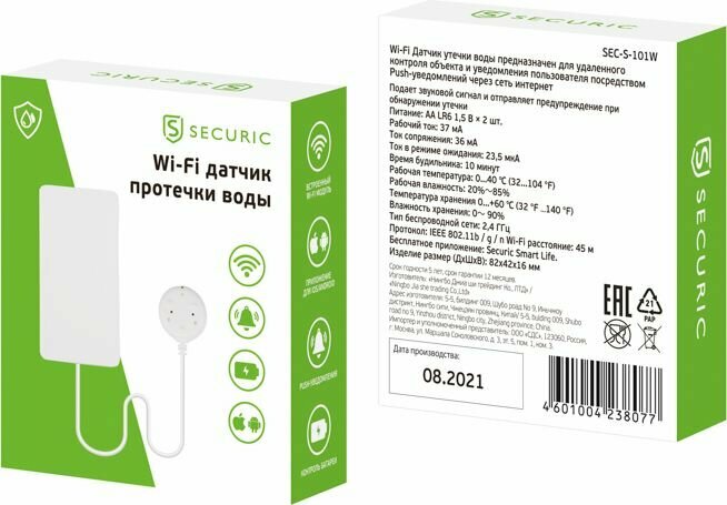 Wi-Fi датчик утечки воды SECURIC 1 шт арт. SEC-S-101W интересное: