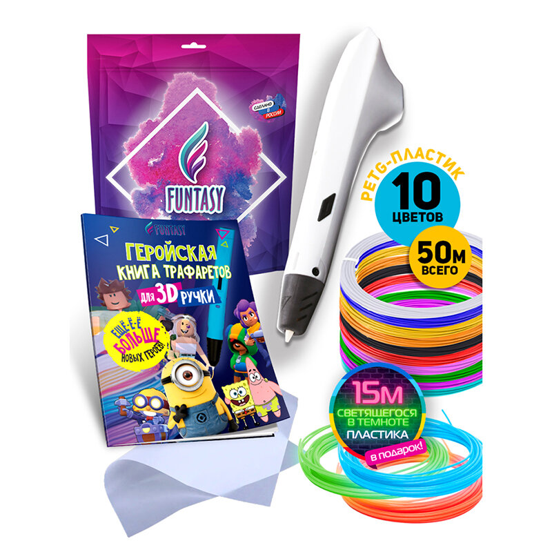 Купить Набор для 3Д творчества Funtasy 3D-ручка Simple + PETG пластик 10 цветов+ PETG LUMI пластик 3 цветов + Книжка с трафаретами HERO