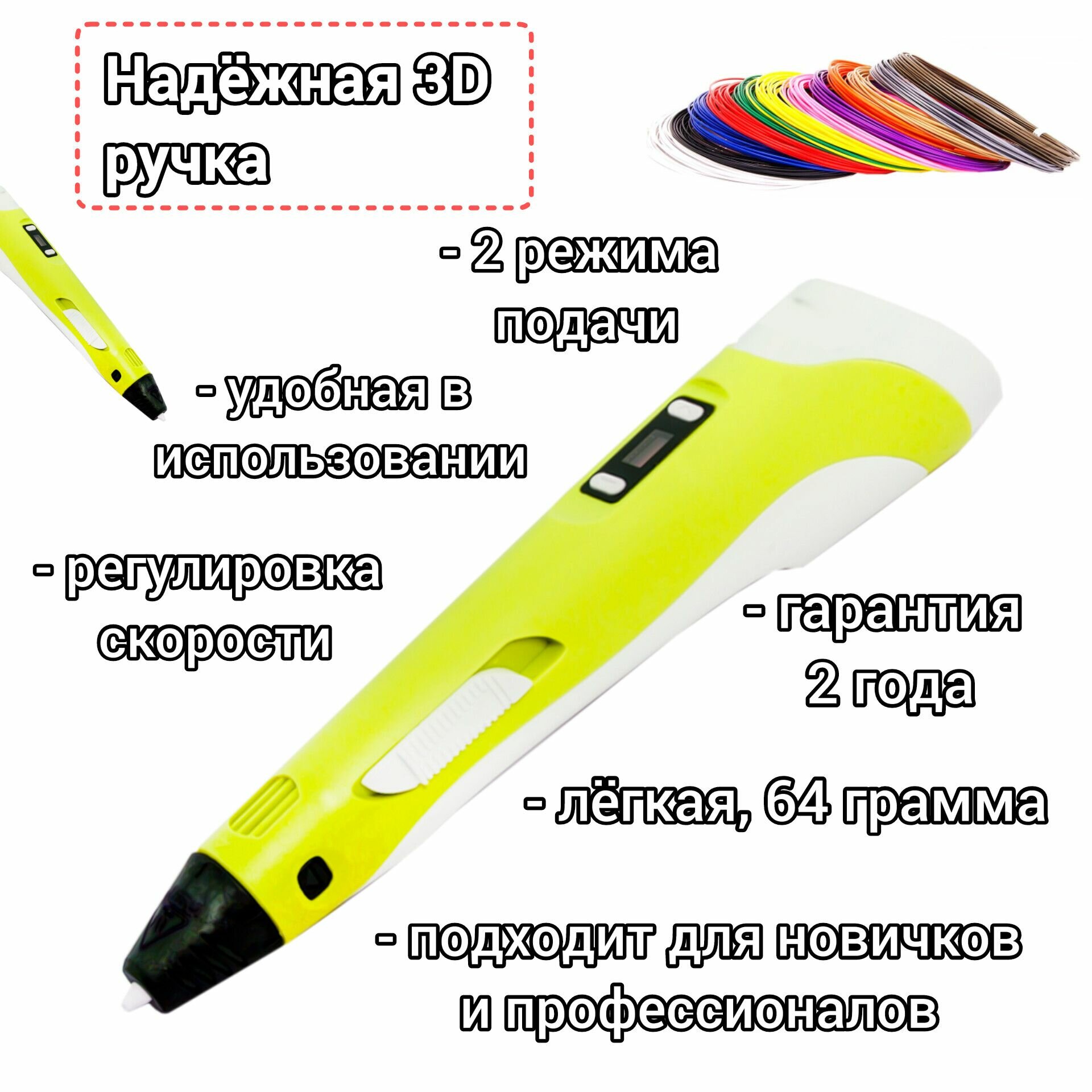 Комплект 3Д ручка NIT-PEN3 желтая + пластик PLA 10 цветов по 10 метров, в упаковке: 1