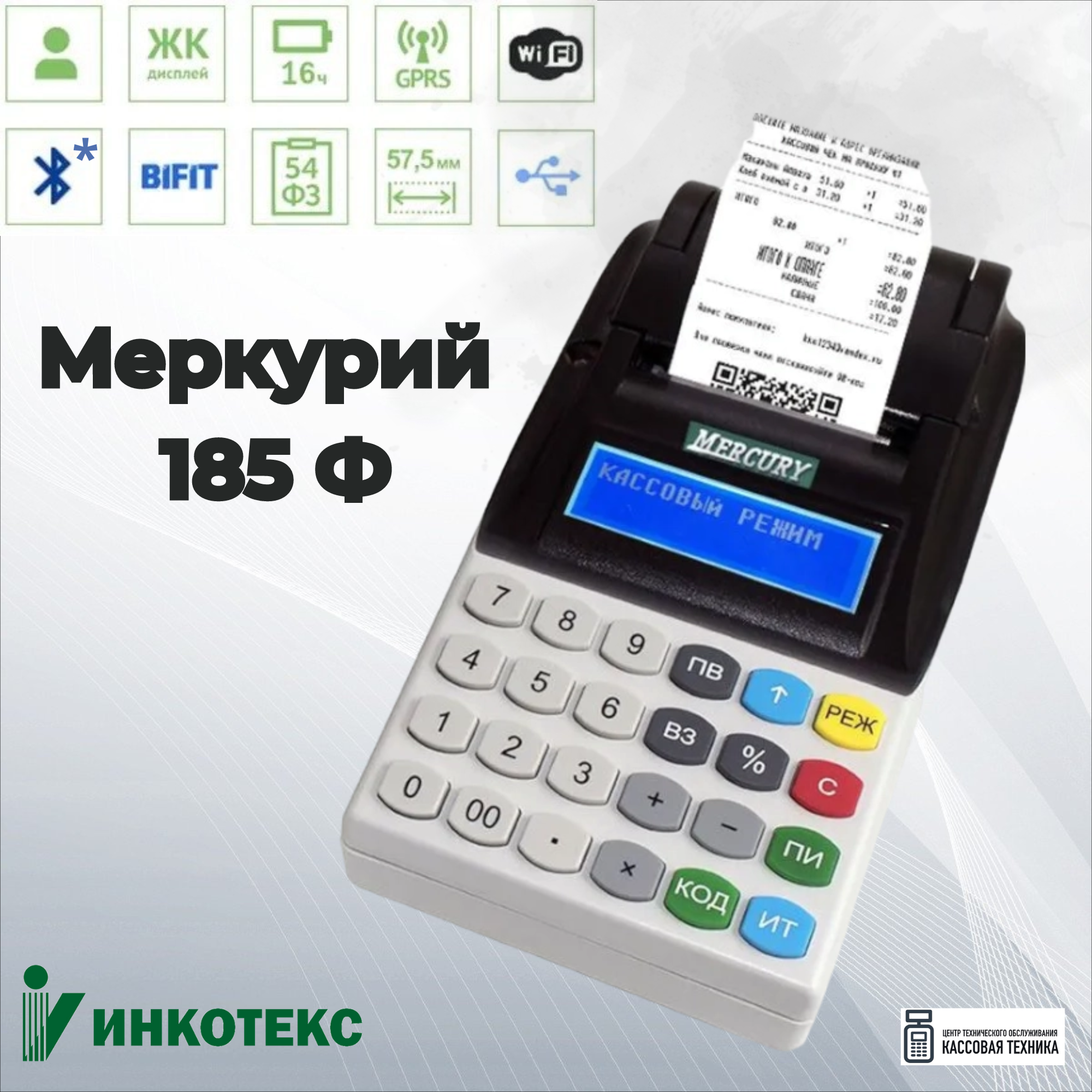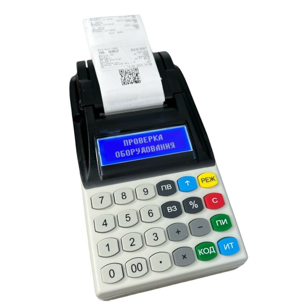 | Дополнительная информация | прорезиненные кнопки клавиатуры; дисплей с подсветкой, регулируемой яркостью и контрастностью; возможность печати логотипов и QR кодов; возможность заведения товарных позиций с помощью подключаемой клавиатуры или с USB накопителя |