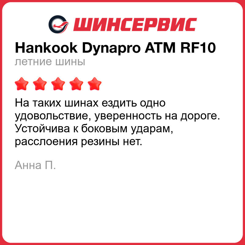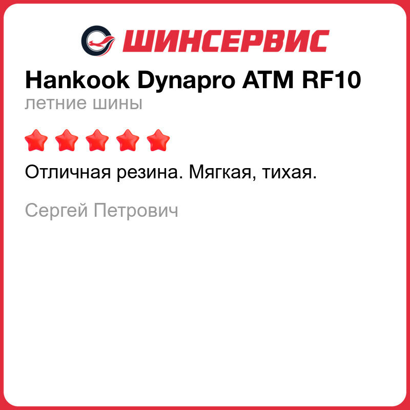 Ниже Вы можете прочитать отзывы на Летние шины Hankook Dynapro ATM RF10 205/80 R16 104T, XL, ознакомится с подробными характеристиками, посмотреть интересные обзоры и фотографии на Летние шины Hankook Dynapro ATM RF10 205/80 R16 104T, XL.