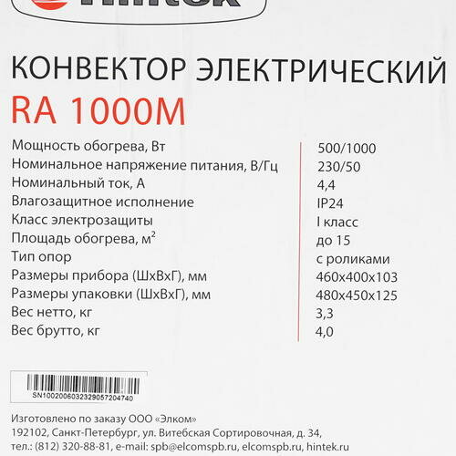 Конвектор электрический Hintek RA 1000M, 1000 Вт, 10 кв.м.