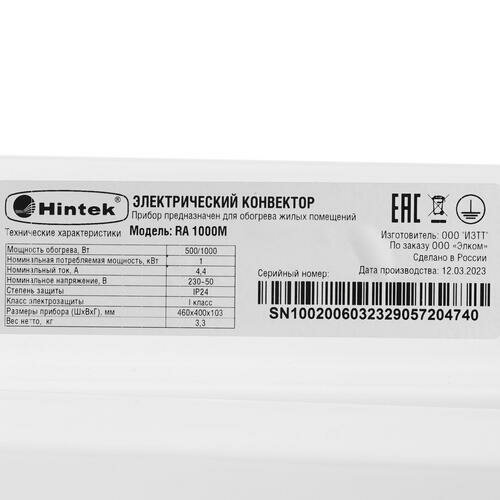 Конвектор электрический Hintek RA 1000M, 1 кВт, 10 кв.м.