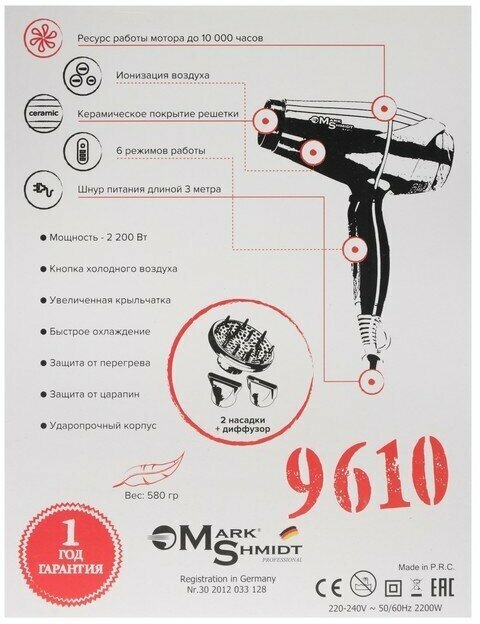 Купить Фен профессиональный с диффузором Mark Shmidt 9610 ionic/ceramic