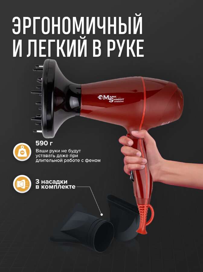 MARK SHMIDT ФЕН для волос 2200W АРТ.9610 С диффузором бордовый