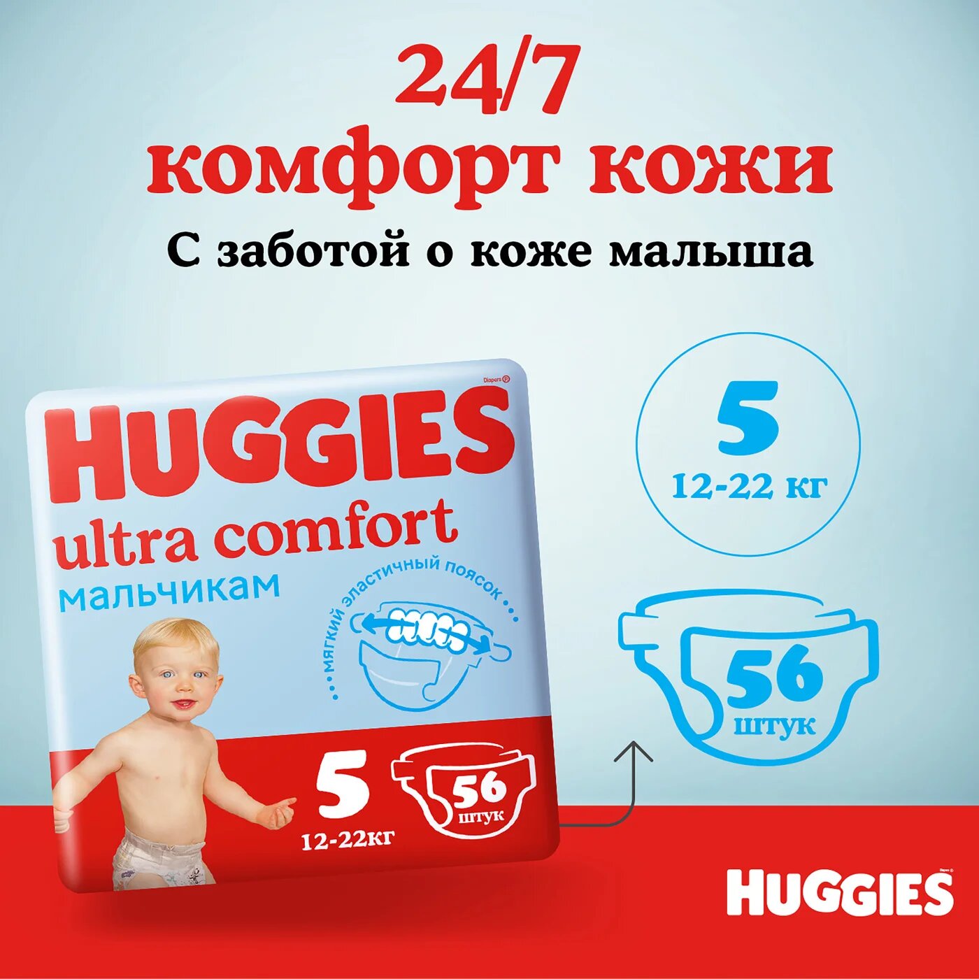 Huggies подгузники Ultra Comfort для мальчиков 5 (12-22 кг), 56 шт., голубой