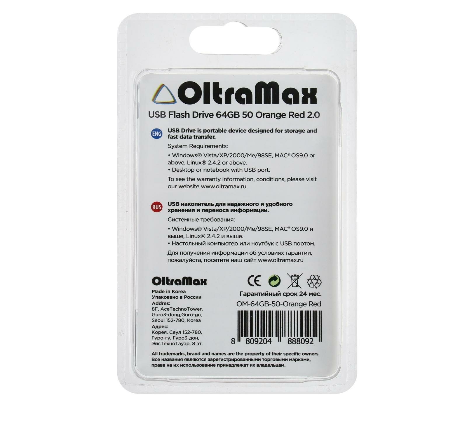 Флеш-накопитель OLTRAMAX OM-64GB-50-Orange Red 2.0 64 ГБ, красный