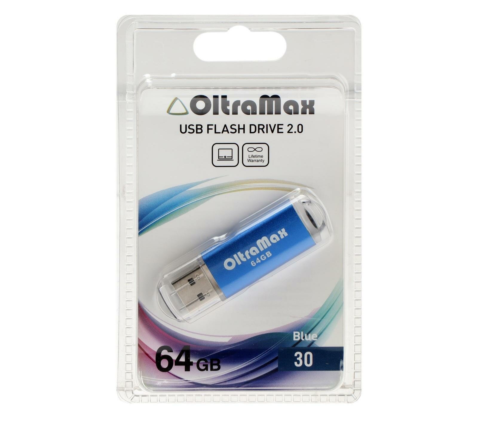 Флешка OltraMax 30, 64 Гб, USB2.0, чт до 15 Мб/с, зап до 8 Мб/с, синяя