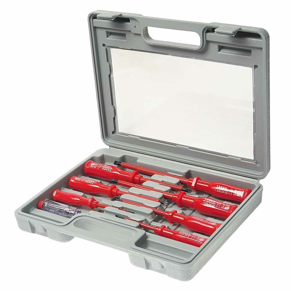 Отвертки диэлектрические до 1000 В, CrV сталь, пластик. ручки, в чемоданчике, набор 8 шт.+ 1 индикаторная FIT 56127