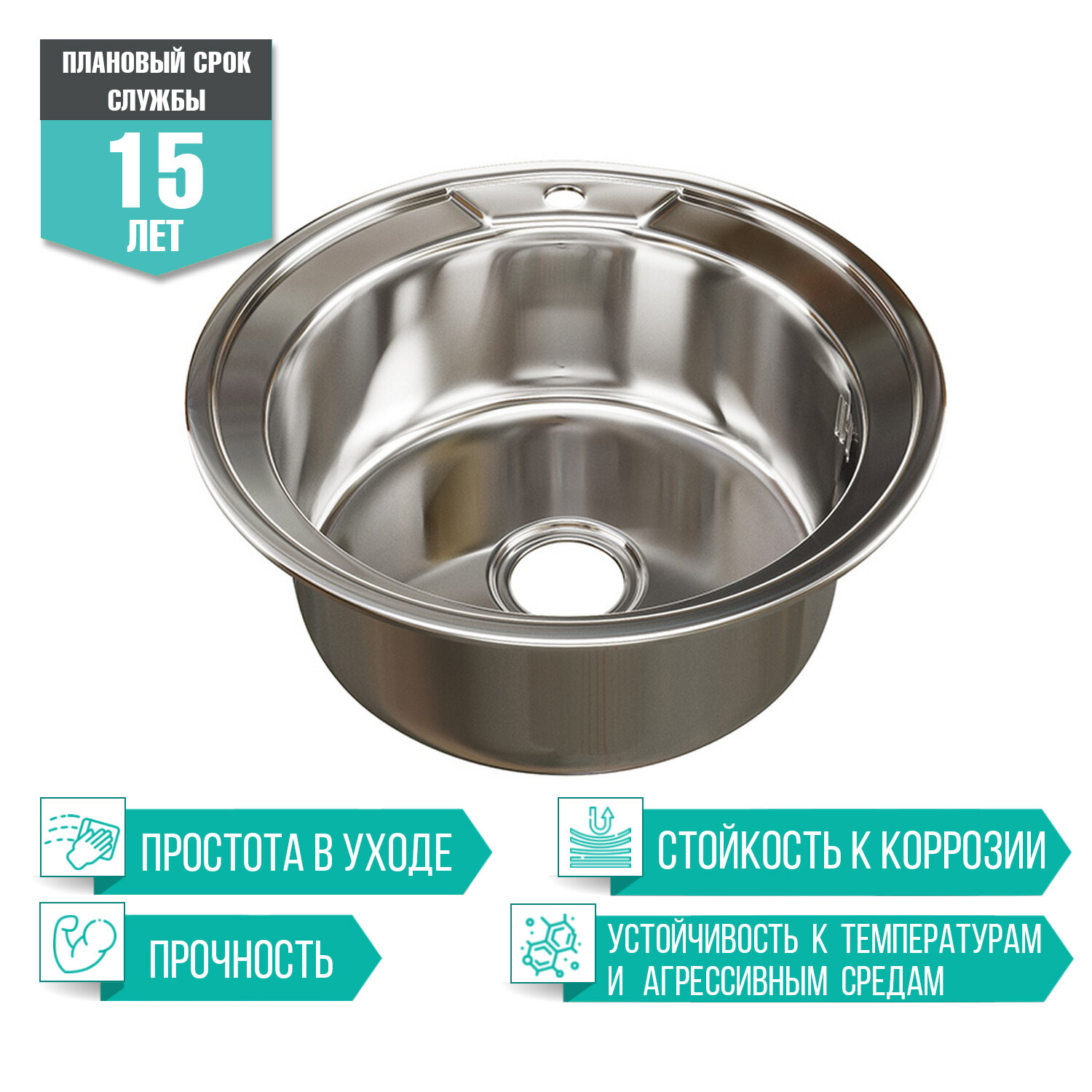 mixline Мойка круг d 51 0,6 вып 3 1/2 глуб чаши 17см с сифоном 528184 .