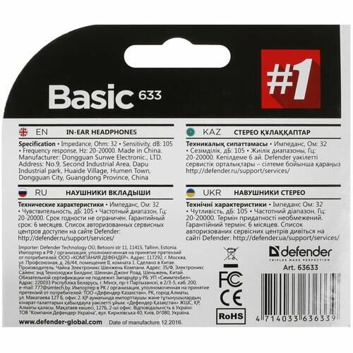 Наушники DEFENDER Basic 633, чёрные. Вкладыши. Диапазон частот: 20-20000 Гц. Сопротивление: 32 Ом. Разъём: 3.5 mm. Длина провода: 1.1 м.