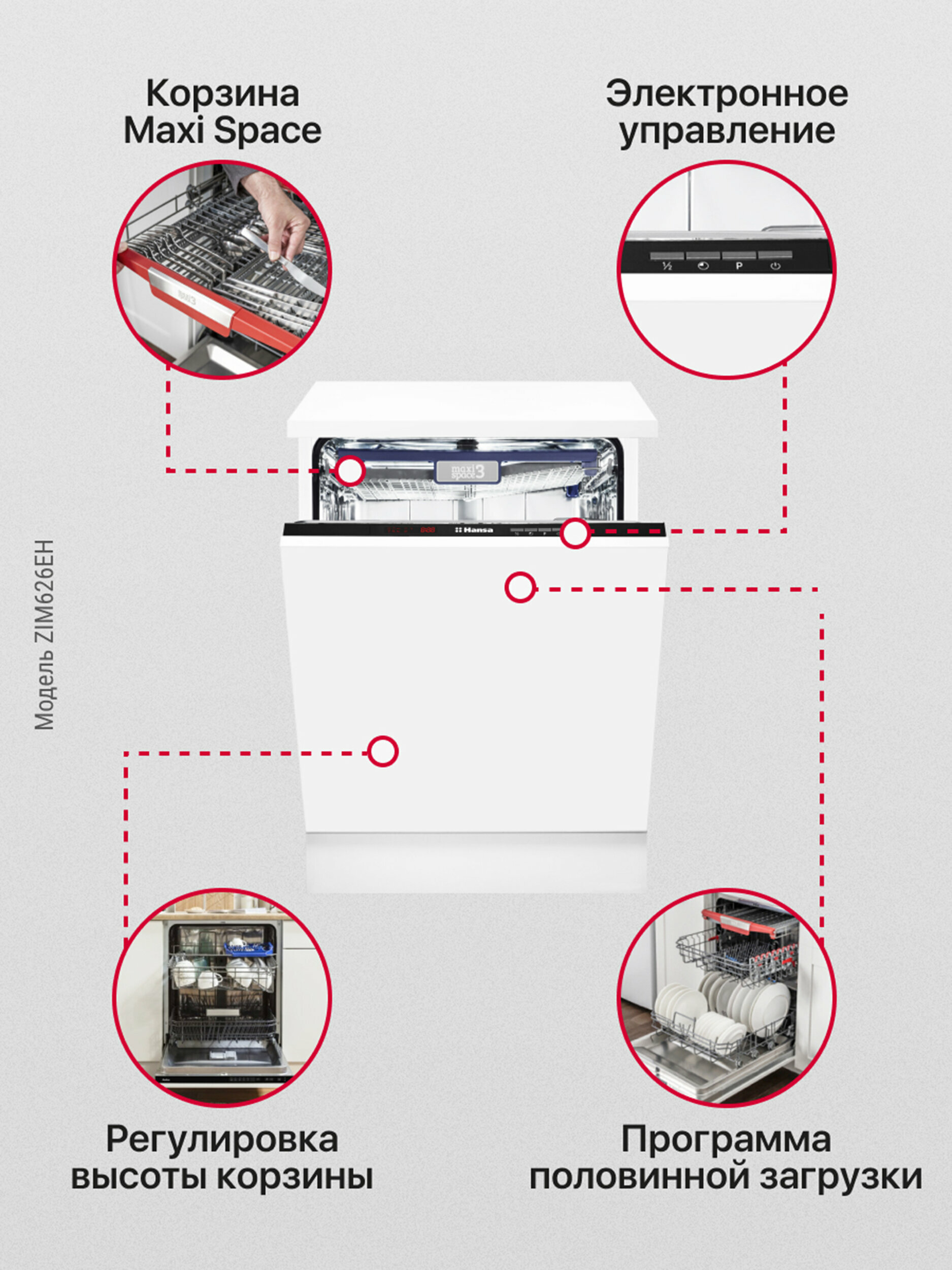 Встраиваемая посудомоечная машина Hansa ZIM626EH, 60 см, с защитой от протечек, 6 программ, 3 корзины, режим быстрой мойки и половинной загрузки, отсрочка старта
