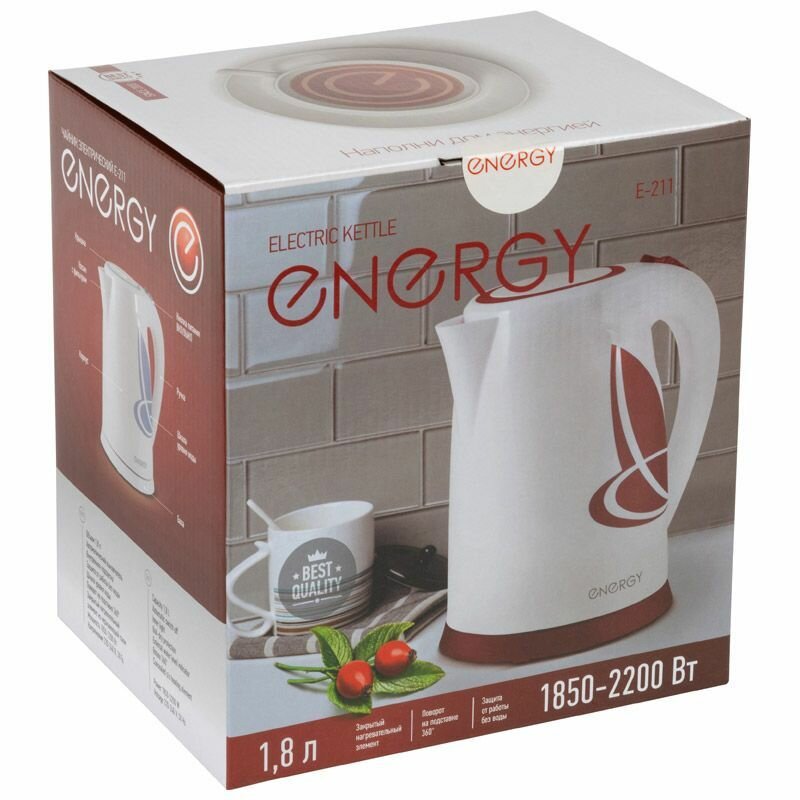 Купить Чайник электрический Energy E-211 диск, 1.8 л, 2.2 кВт, пластик, бело-красный