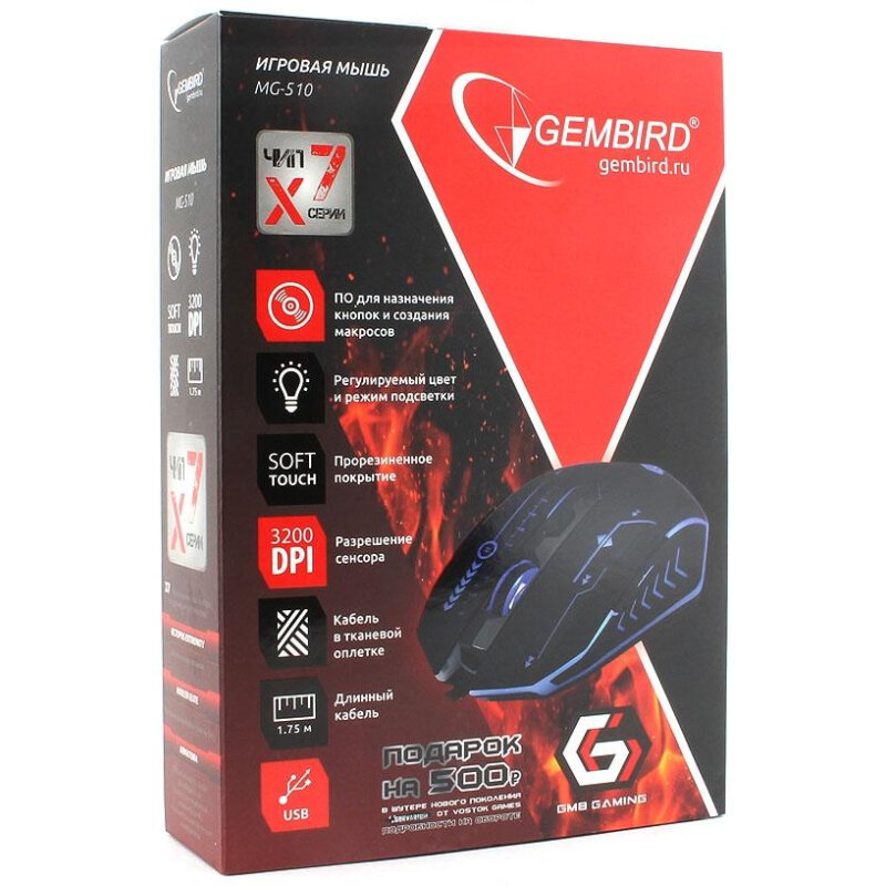 Мышь проводная Gembird MG-510, USB, 5кнопок+колесо-кнопка, 3200DPI, 1000 Гц, подсветка, программное обеспечение для создания макросов