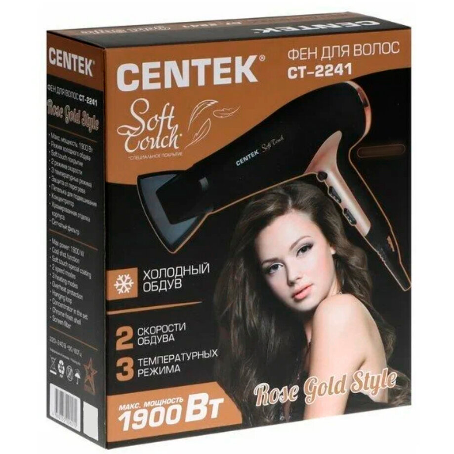 Фен Centek CT-2241 (розовое золото+черный) 1900Вт, 2 скорости, 3 режима, холодный обдув, Soft Touch