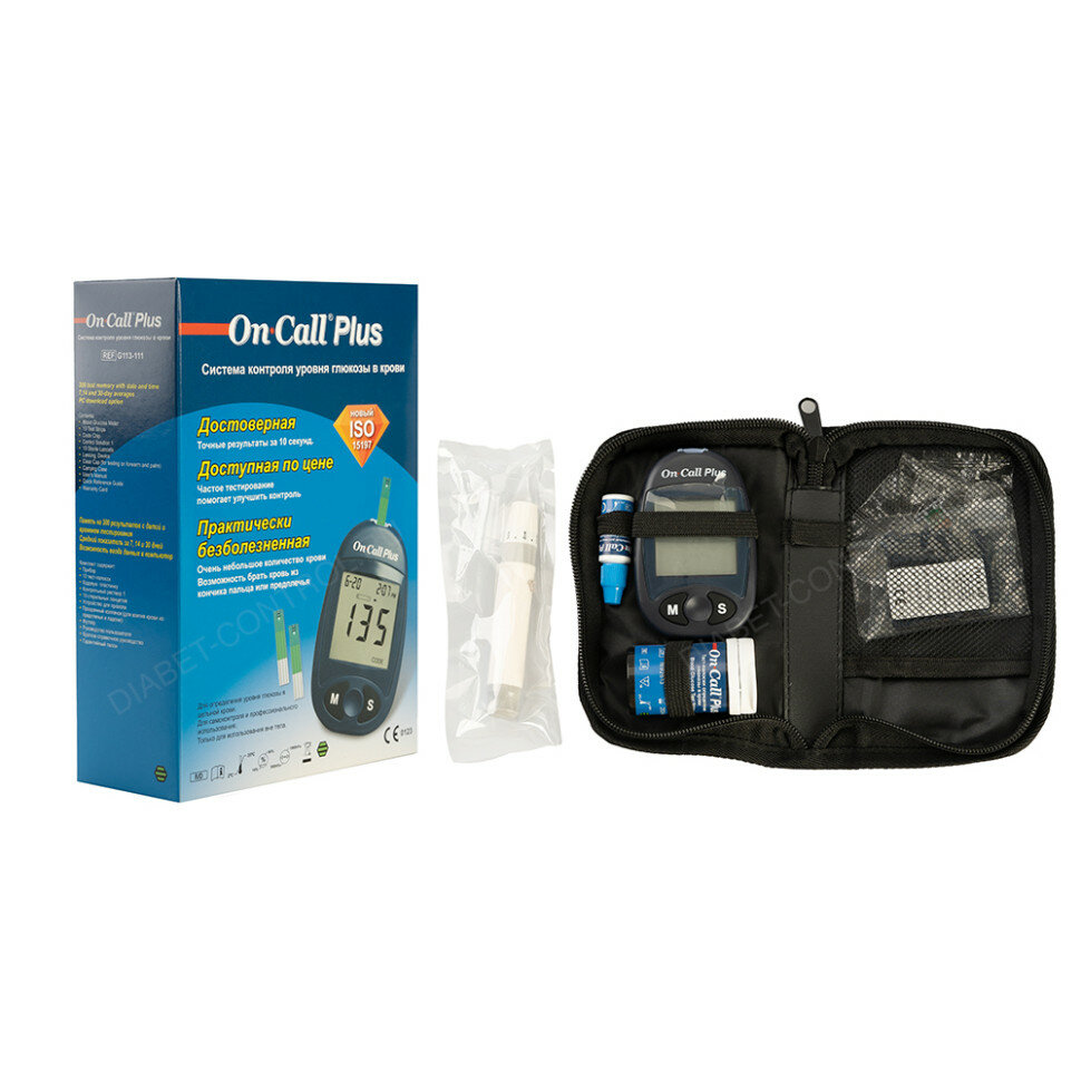 Глюкометр Он Колл Плюс (On Call Plus) - в наборе прокалыватель, ланцеты (10 шт), полоски (10 шт), чехол