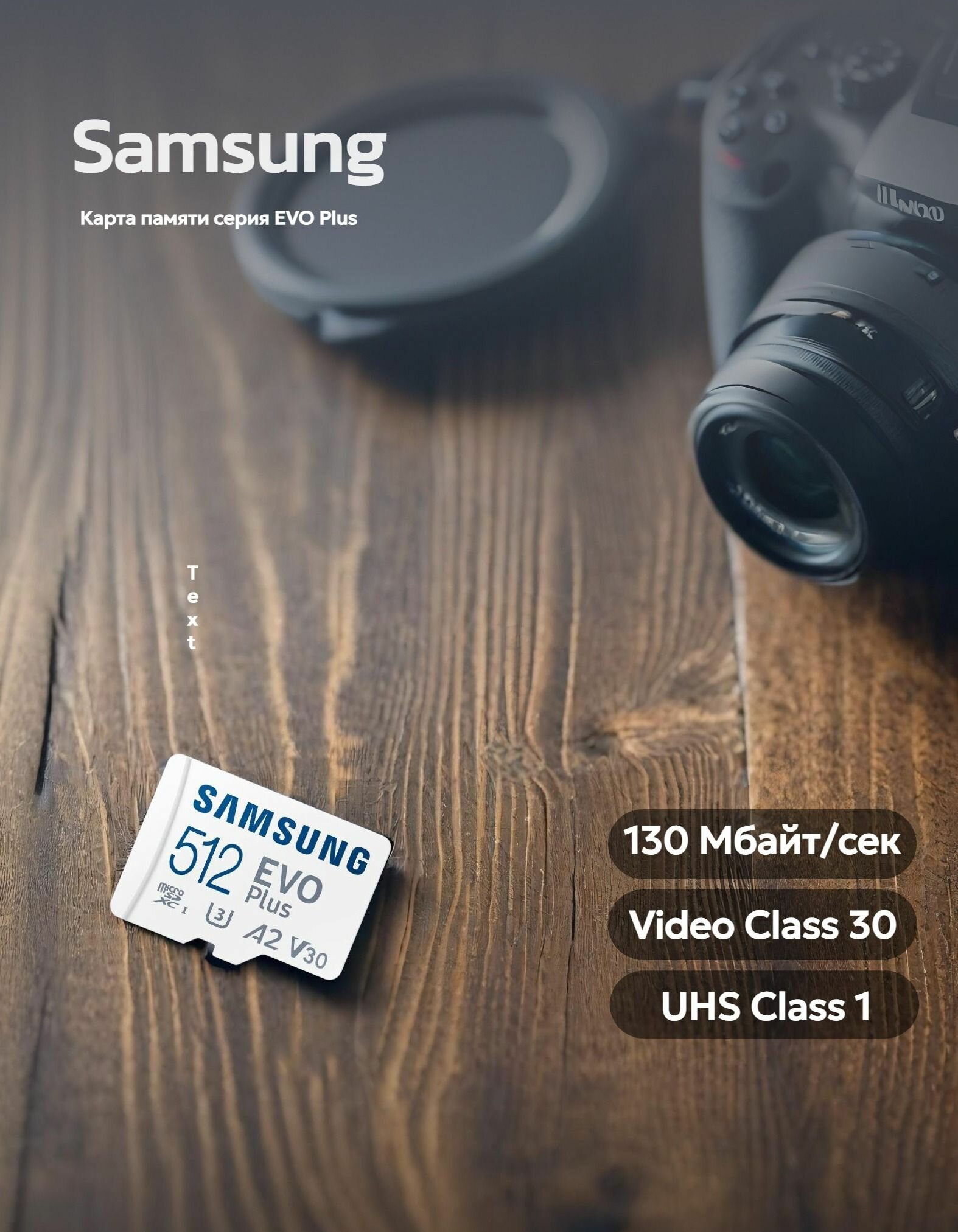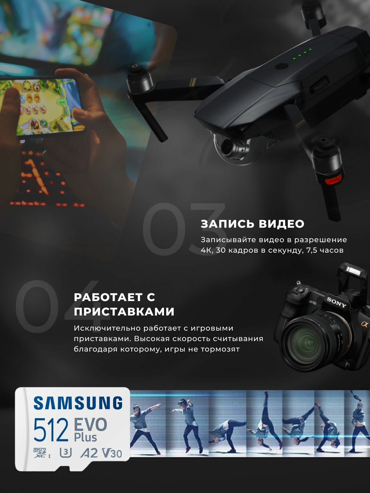 Карта памяти Samsung EVO Plus microSDHC 512 ГБ A2, UHS Class 1 запись - 130 Мбайт/сек