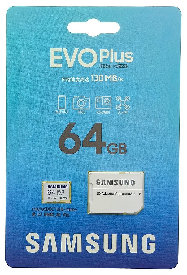 Карта памяти Samsung EVO Plus microSDXC 64 ГБ Class 10, V10, A1, UHS-I U1, R 130 МБ/с, адаптер на SD