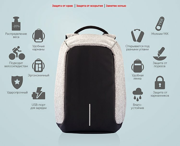 | Плюсы: | удобный; равномерное распределение веса; анти-вор; множество карманов, к которым может добраться только владелец; зарядка телефона; материал. |