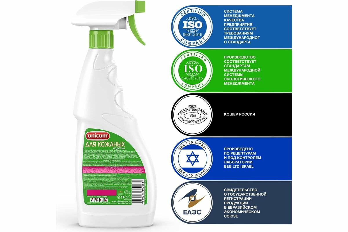 Очиститель средство для чистки изделий из кожи очистки обивки мягкой мебели кожаных диванов ухода за салоном автомобиля Unicum 500 мл спрей