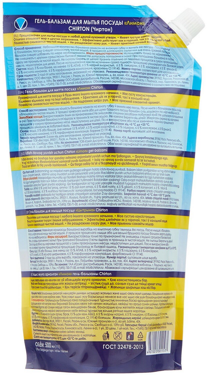 Гель-бальзам для мытья посуды Чиртон Лимон Дой-пак 500мл CHIRTON(АН3!)