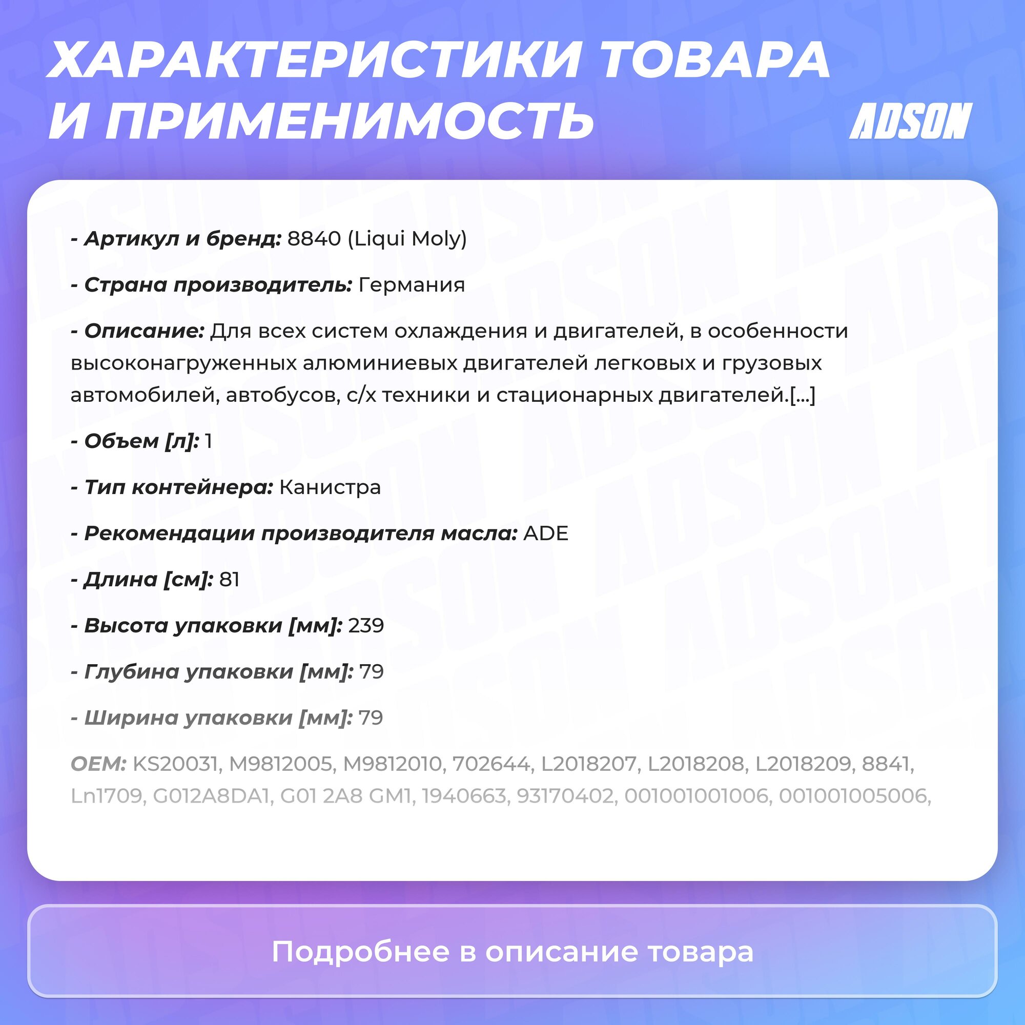 | Плюсы: | Качественная немецкая химия, возможность смешения с антифризами g11 (зелеными и синими) |
