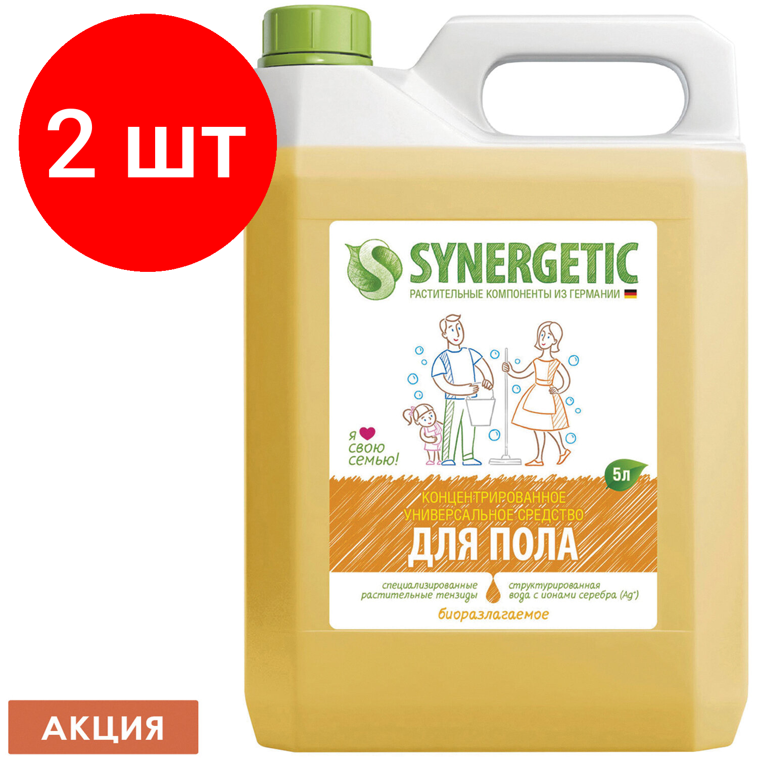 Купить Комплект 2 шт, Средство для мытья пола и поверхностей 5 л SYNERGETIC, c дезинфицирующим эффектом, биоразлагаемое, 101500