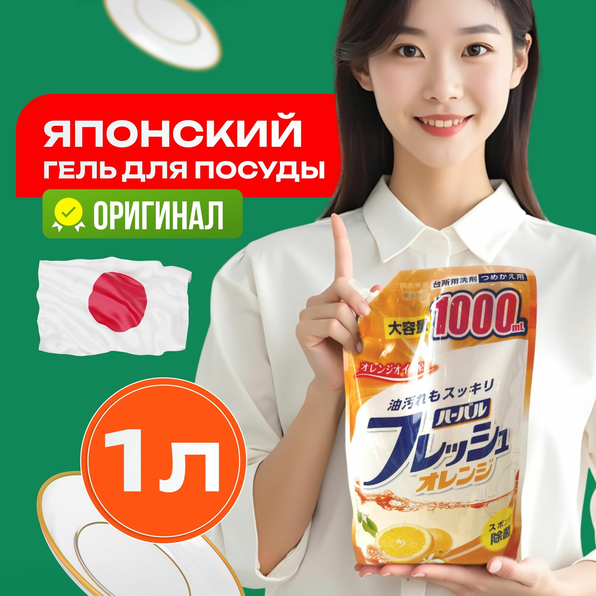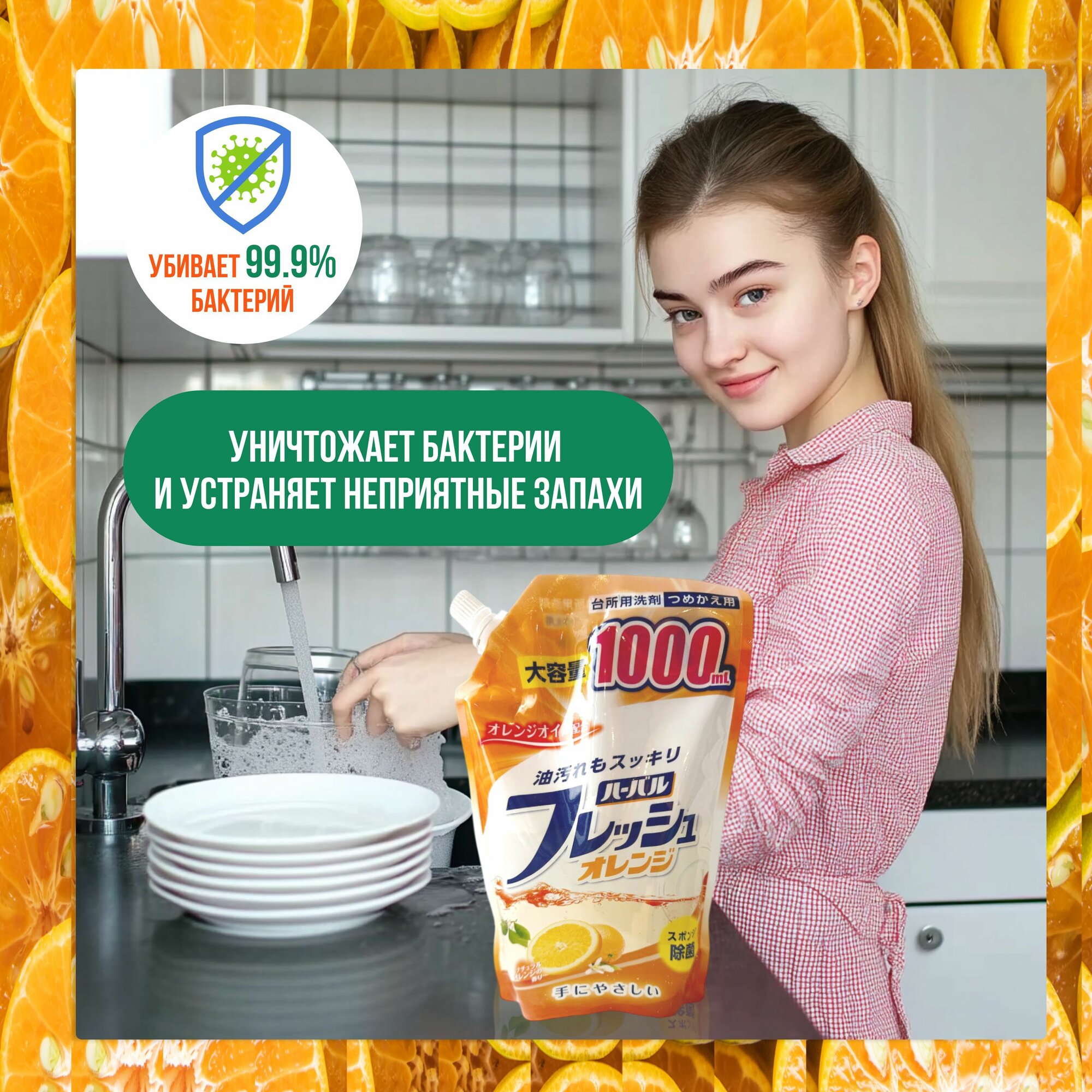 Mitsuei Японское средство для мытья посуды, овощей и фруктов, биоразлагаемое, антибактериальное, с ароматом апельсина, 1000 мл / Гель для мытья детской посуды и игрушек универсальный