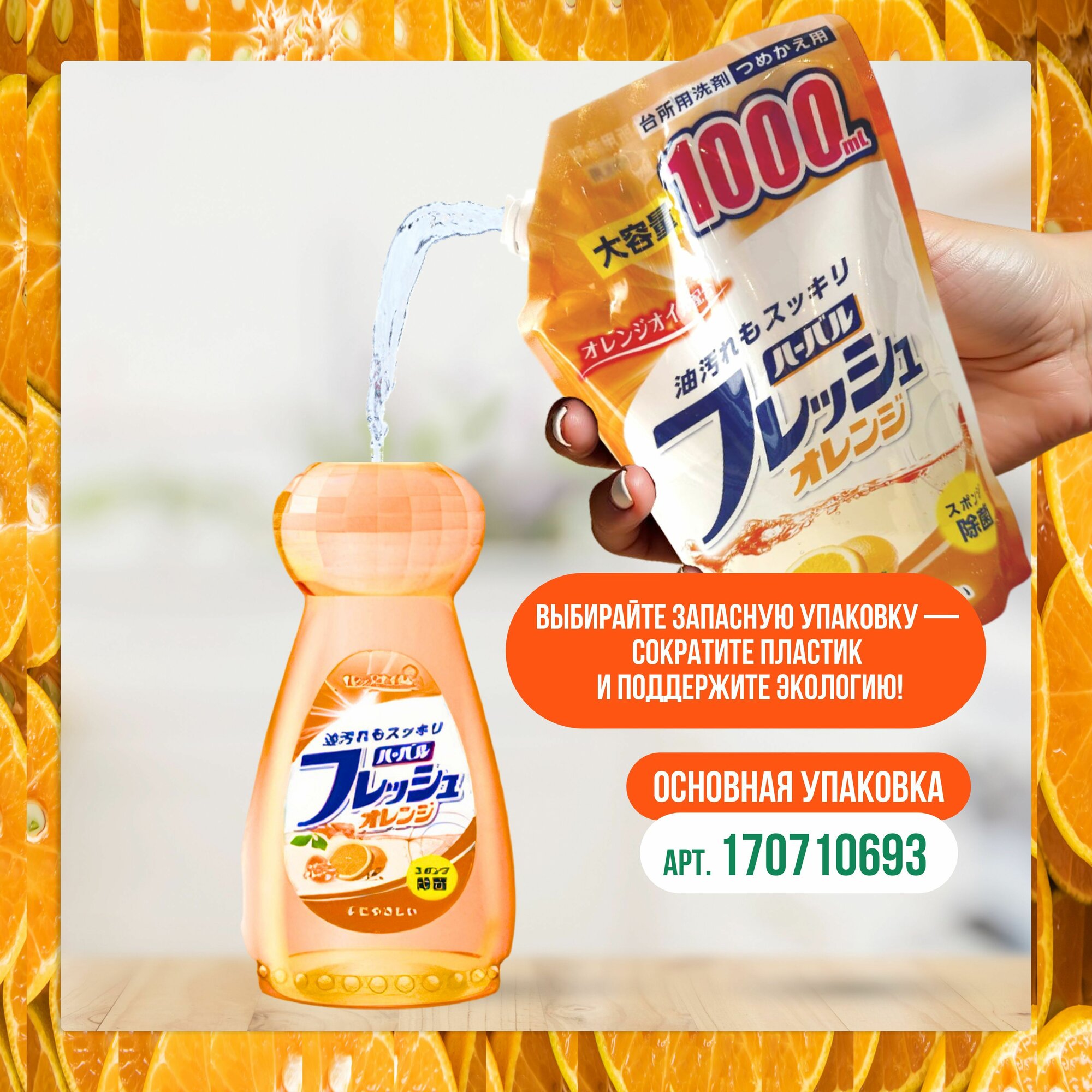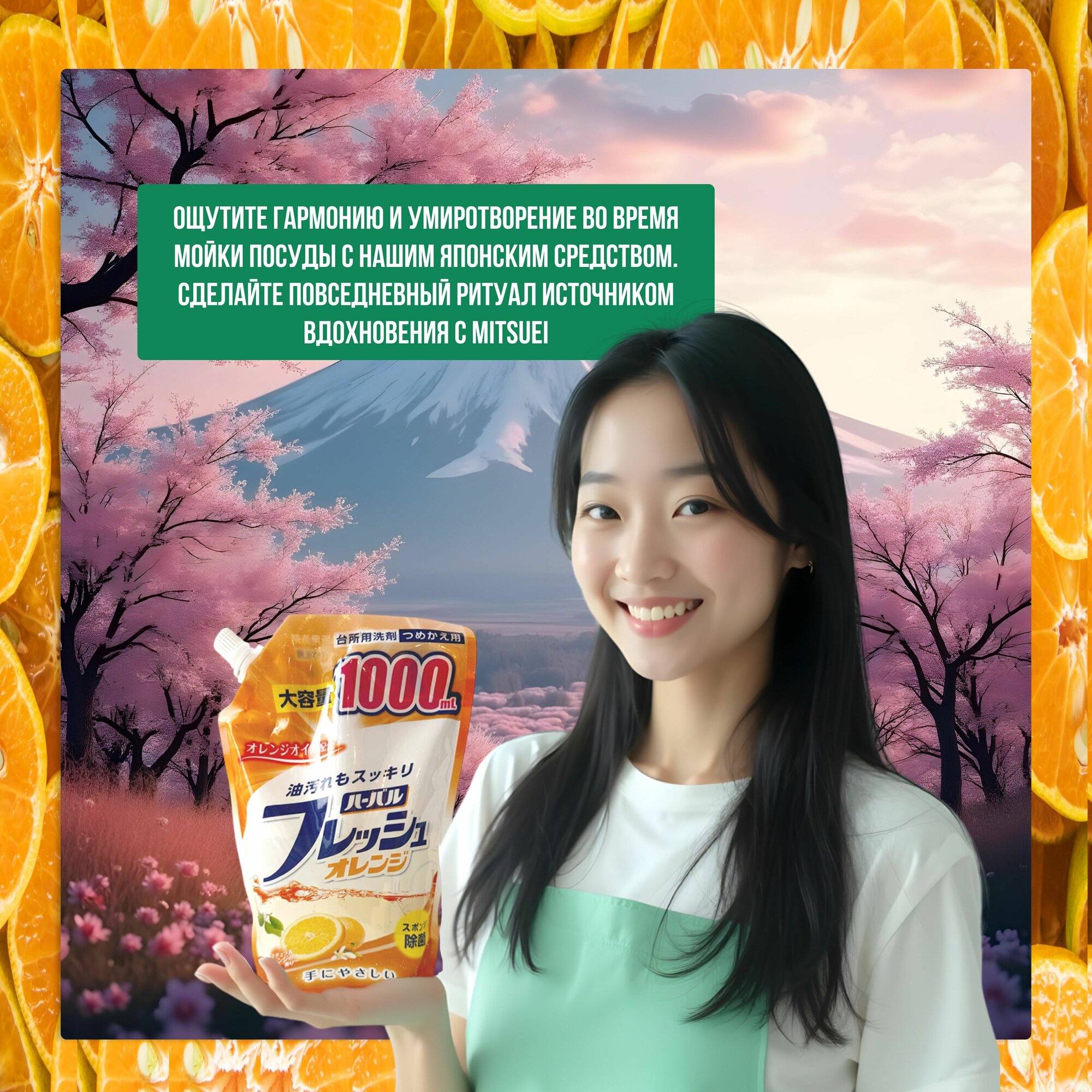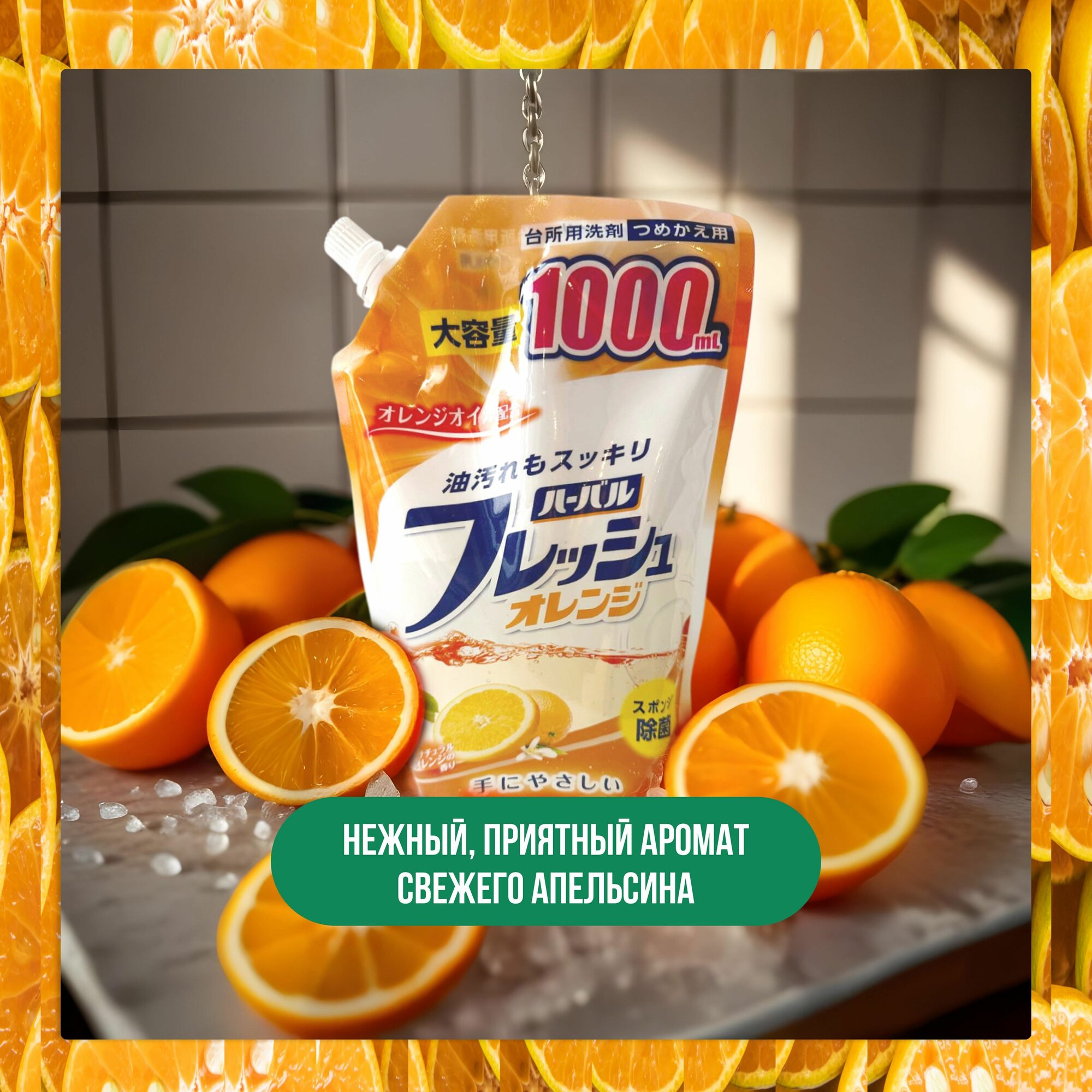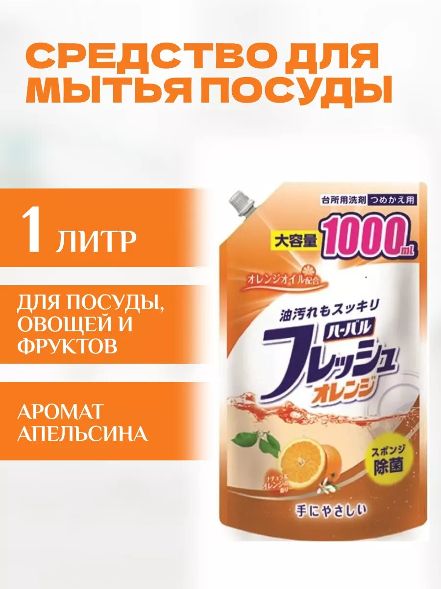 Mitsuei средство для мытья посуды, овощей и фруктов, аромат апельсина, мягкая упаковка, 1000 мл