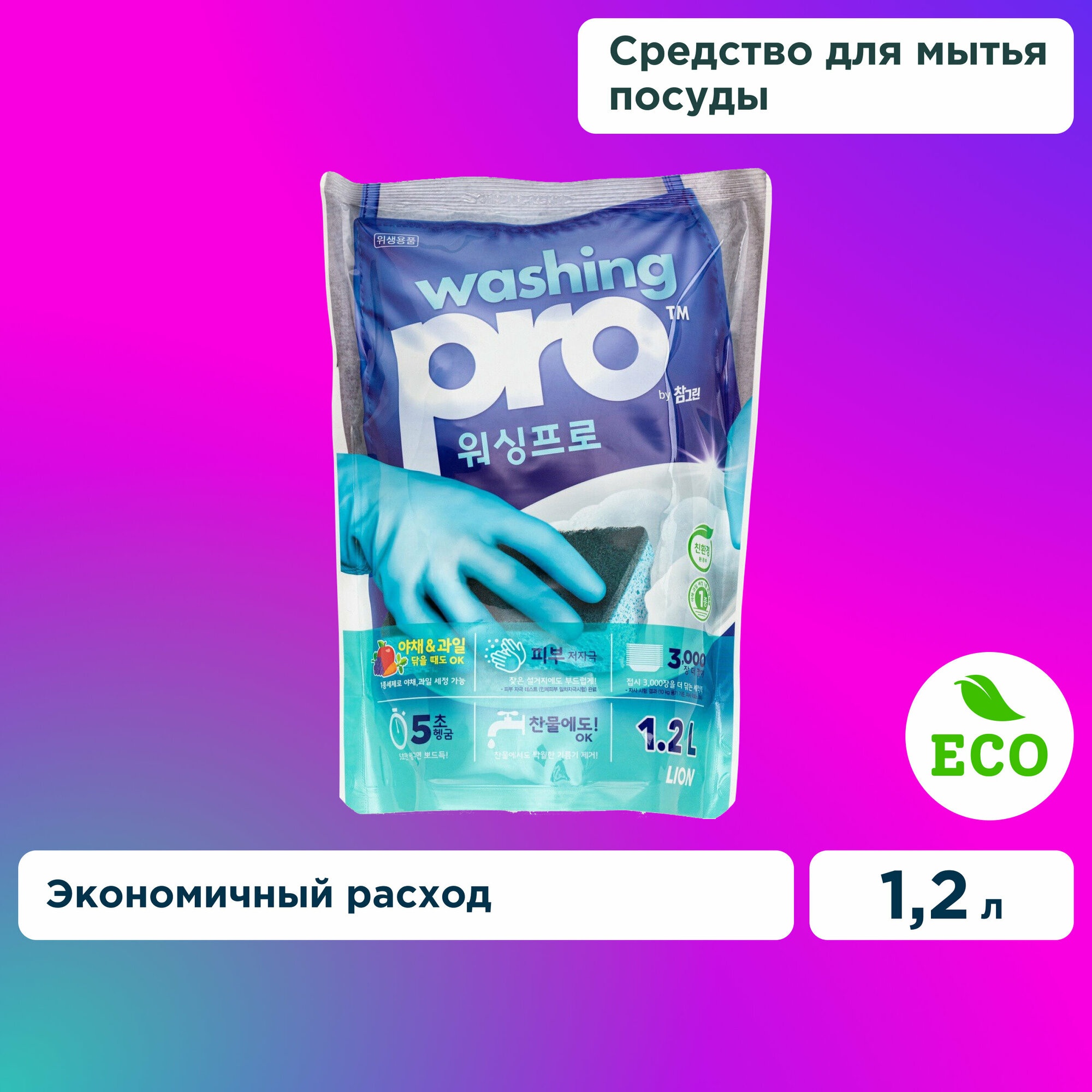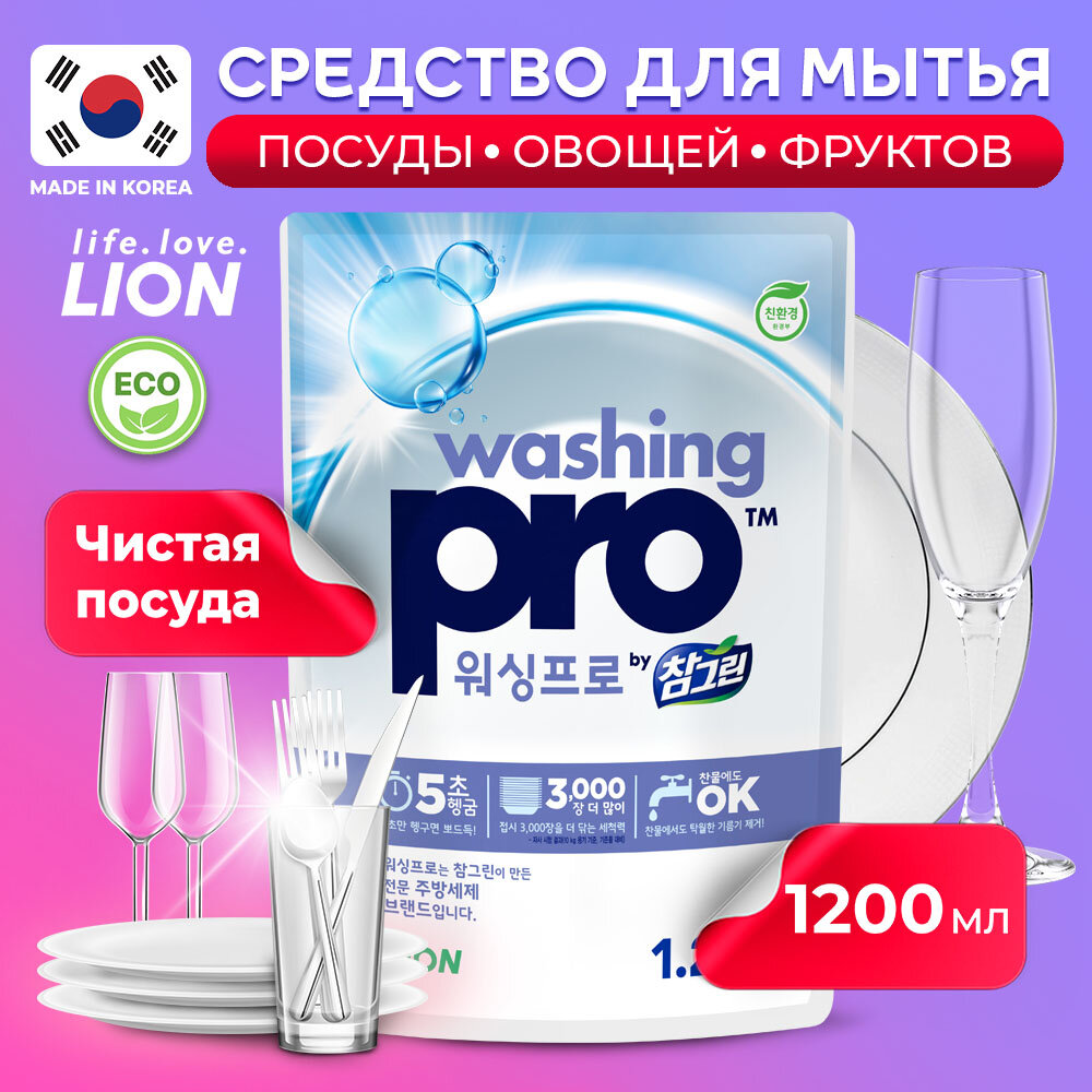 Lion Средство для мытья посуды Washing Pro, мягкая упаковка, 1200 мл