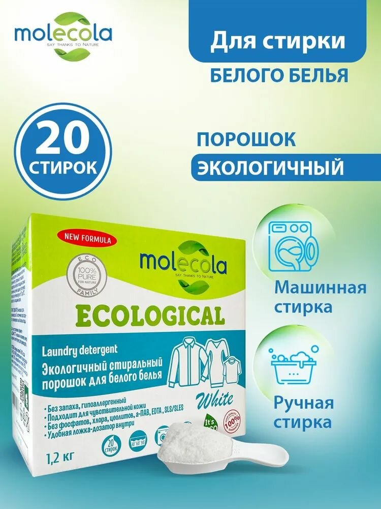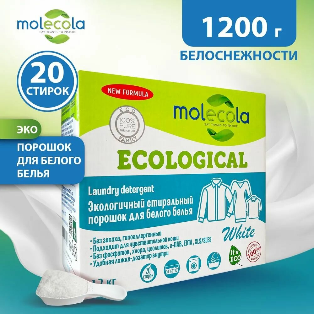 Купить MOLECOLA Экологичный стиральный порошок с растительными энзимами для белого белья и одежды 1,2 кг