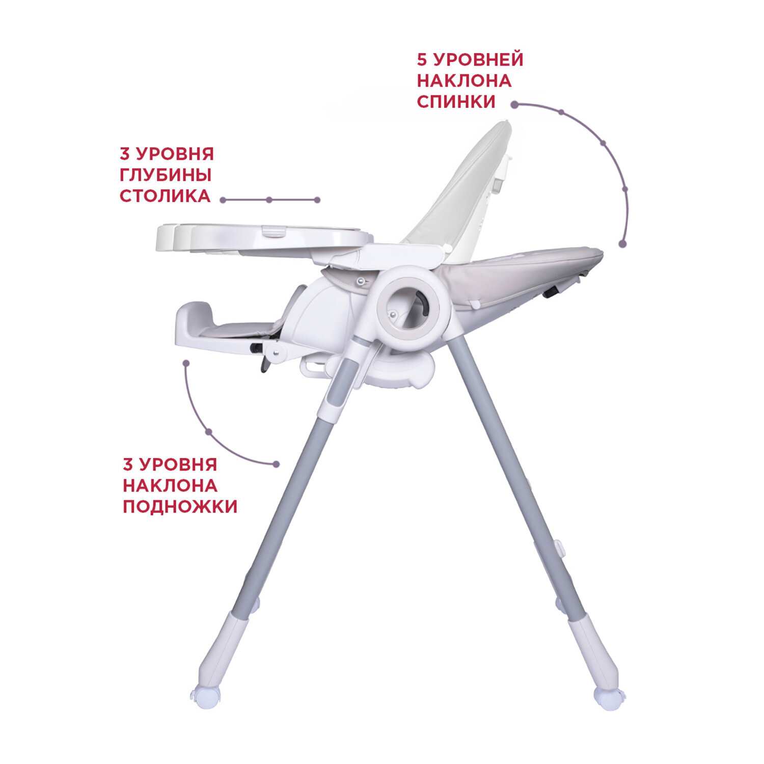 Сиденье стульчика можно закрепить на разной высоте. Спинка регулируется до полулежащего положения. Съёмный столик, что очень удобно для первого прикорма. Покупкой очень довольны.