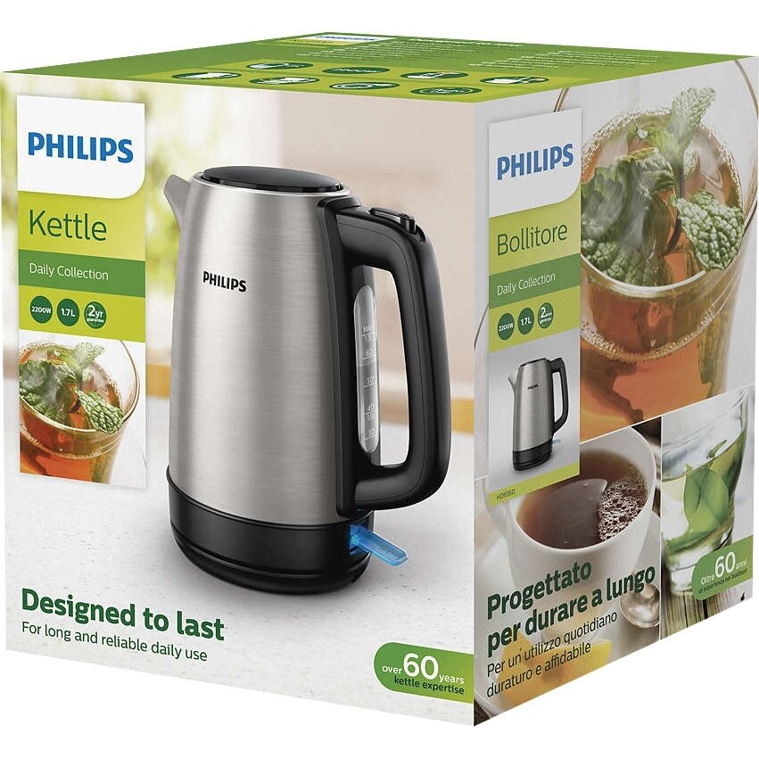 Электрический чайник Philips Daily Collection HD9351/90, 1,7 л, 2200 Вт, нержавеющая сталь, полипропилен (ПП), индикатор уровня воды, беспроводной