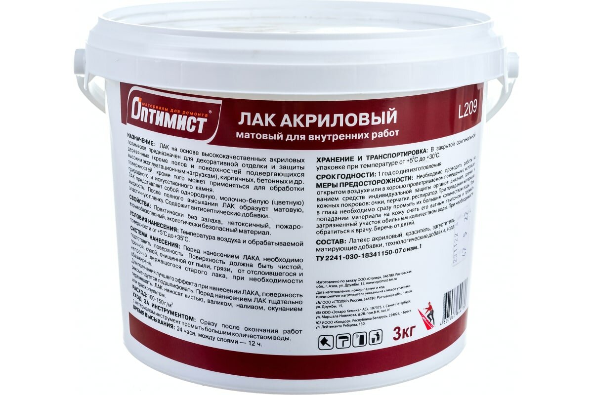 Лак Оптимист L209 акриловый матовый для внутренних работ 3кг
