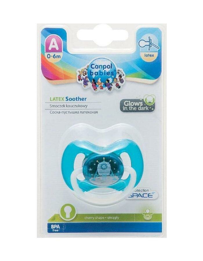 Пустышка Canpol Babies круглая латексная 0-6 месяцев Space, цвет: бирюзовый/для новорожденных/от 0 месяцев/светится в темноте/соска латексная