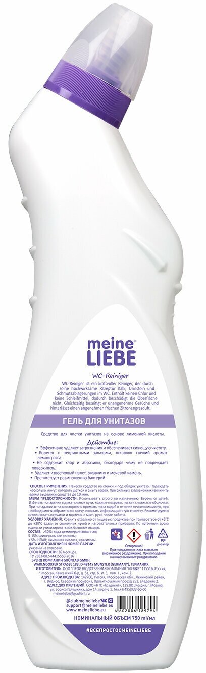 Гель MEINE LIEBE с лимонной кислотой для чистки унитазов, 750 мл