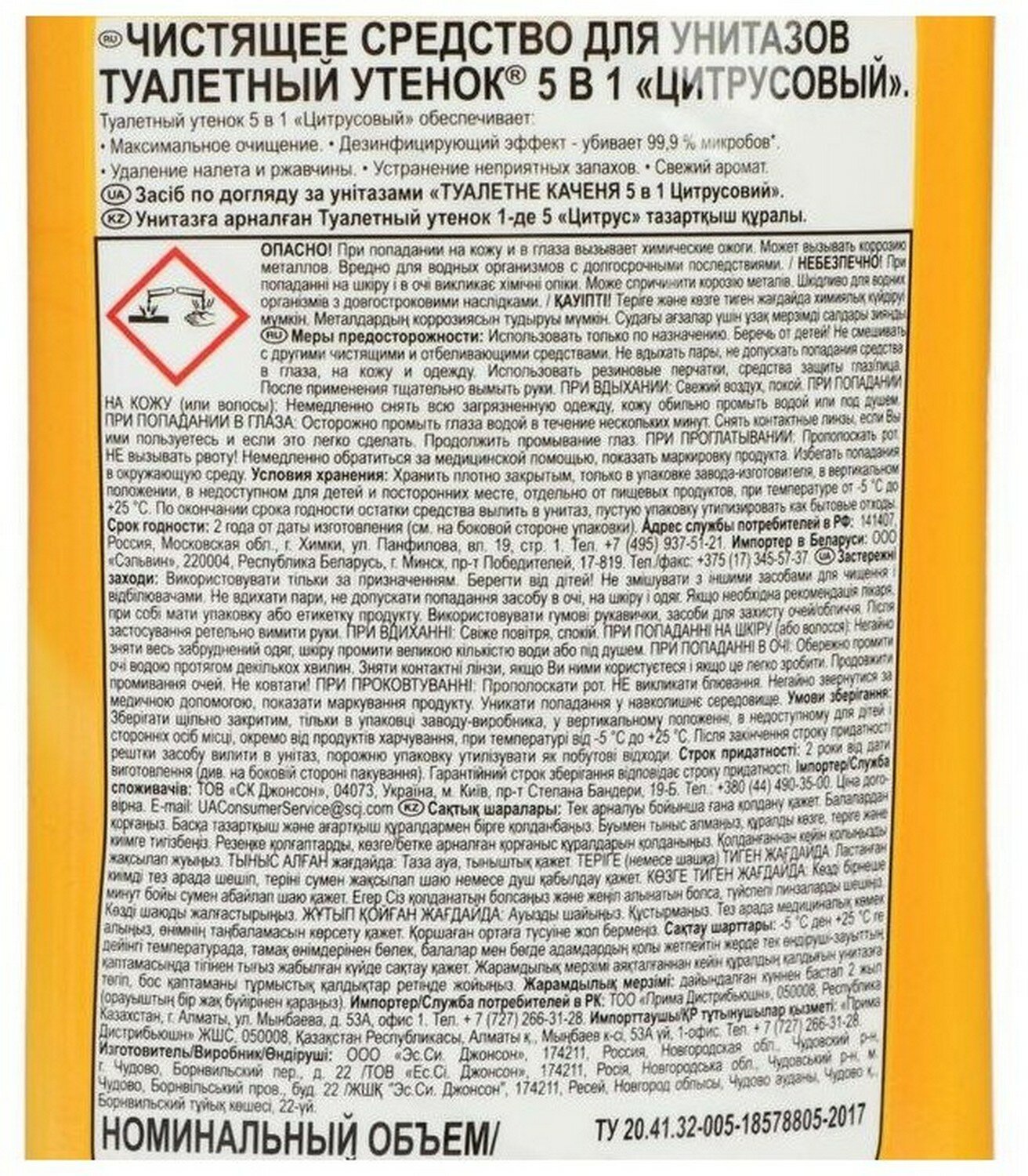 Туалетный Утёнок 5 в 1 Цитрусовый - Чистящее средство для унитаза 900 мл