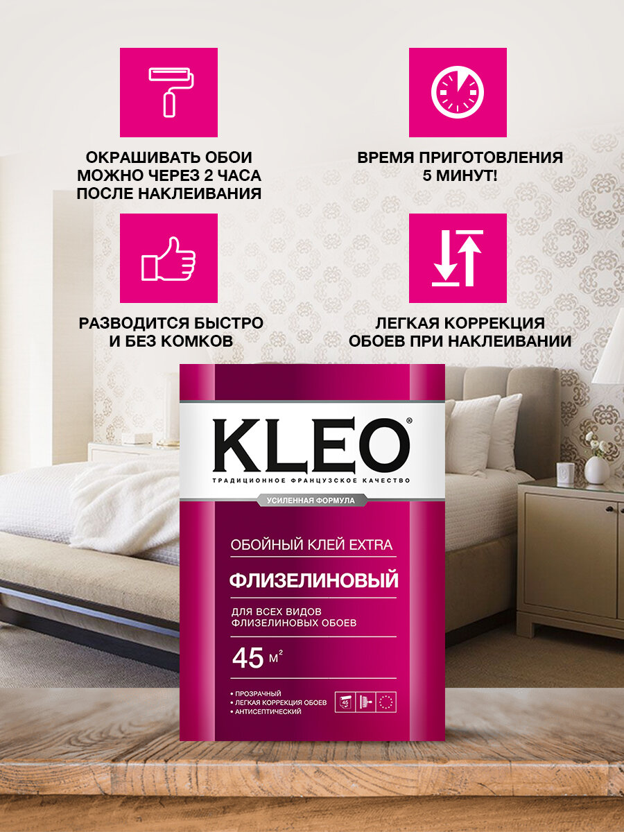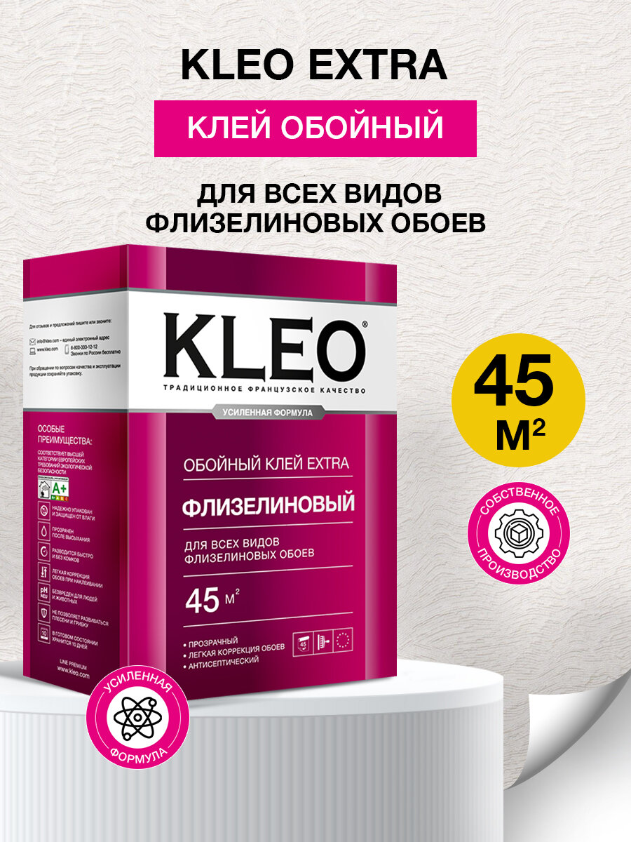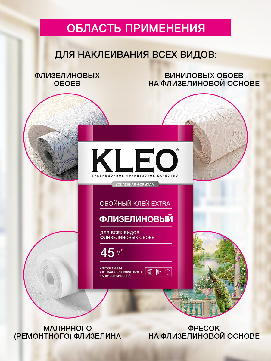 Клей для обоев KLEO EXTRA INDICATOR 45 усиленная формула с индикатором,обойный клей для виниловых, флизелиновых, бумажных, для обоев на основе малярного флизелина, антигрибковая и антисептическая формула Клео Экстра